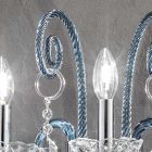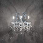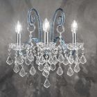 Lampă de perete cu 3 lumini realizată manualdin sticlă venețiană cu finisaj denim, cu pandantive de plumb și detalii din metal cromat lustruit . Caracterizata prin minunatele brate lucrate manual prin tehnica rasucirii care creeaza un rezultat exclusiv ce aminteste estetic de impletirea unei sfori, aceasta lampa da personalitate intregului mediu inconjurator. O adevărată ploaie de lumină invadează structura lustrei și apoi se răspândește în mediul înconjurător prin intermediul refracției prin magia paietelor și pandantivelor de cristal cu finisaje fine, creând astfel un efect scenografic evocator și oniric capabil să încânte și să surprindă. pentru eleganța și măreția sa.