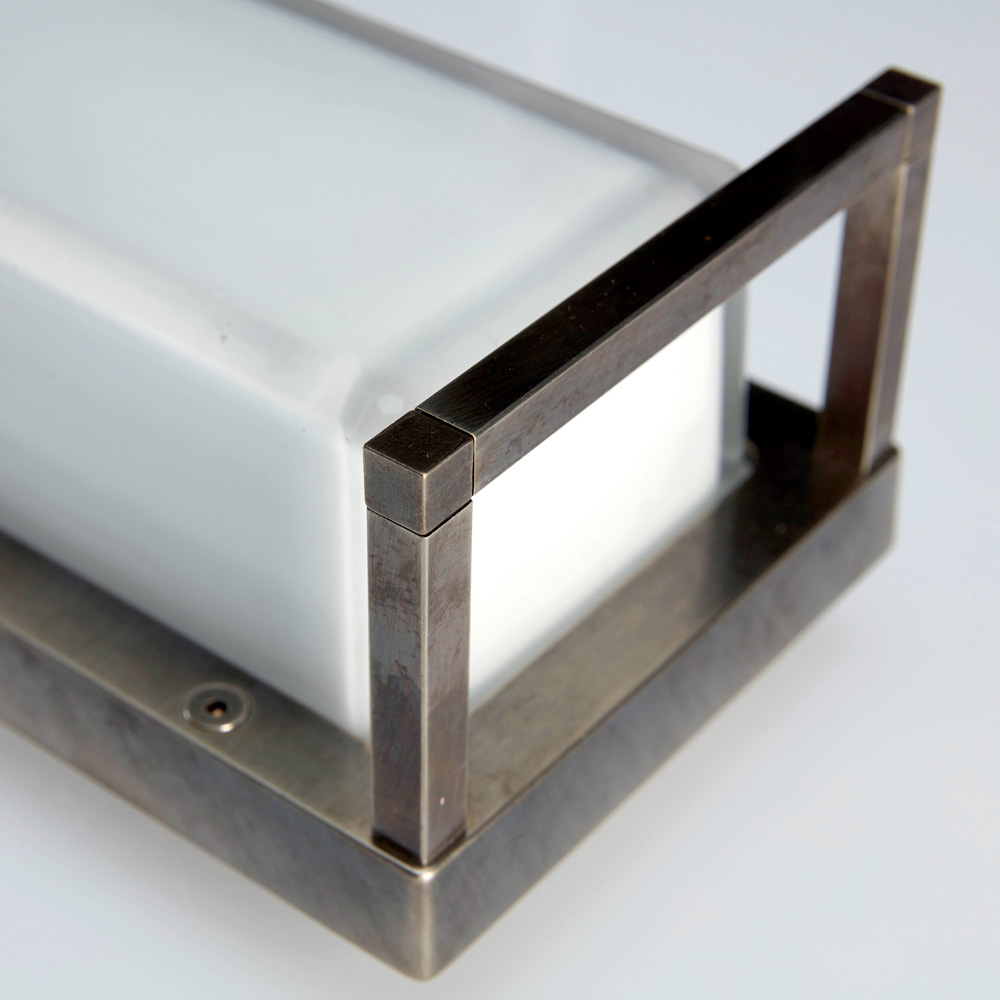 Simplă și elegantă, această aplică de perete lucrată manual este o soluție de iluminat rafinată, concepută pentru a pune în valoare pereții moderni și spațiile contemporane. Structura din alamă turnată , combinată cu un difuzor dreptunghiular din sticlă opal , creează o lumină blândă și uniformă, ideală pentru un iluminat primitor și funcțional.
