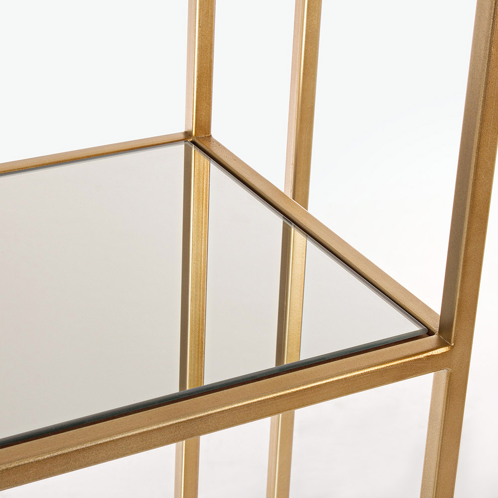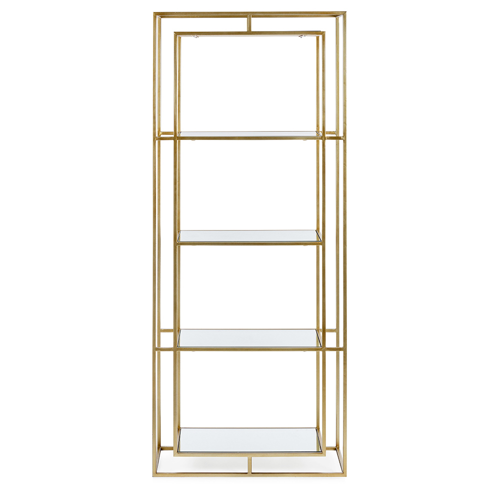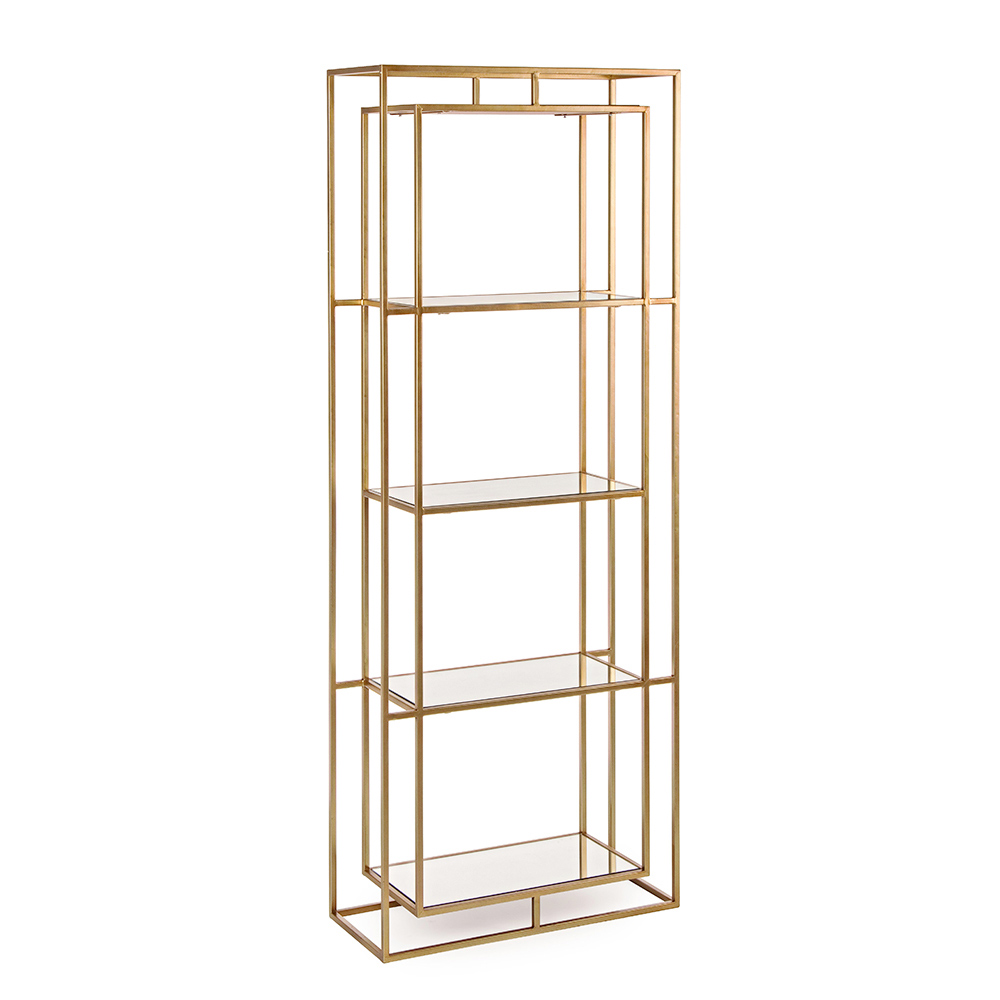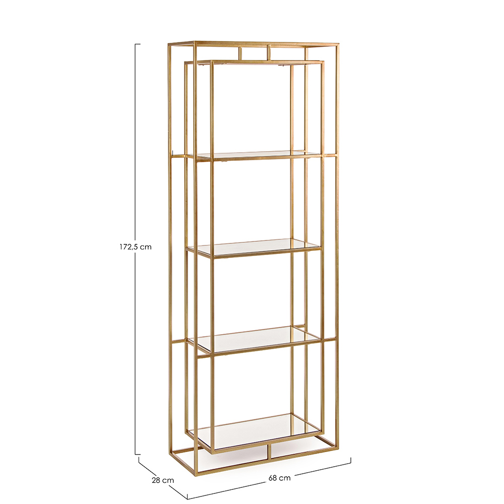 Bibliotecă de sine stătătoare din oțel și rafturi de sticlă cu design elegant.