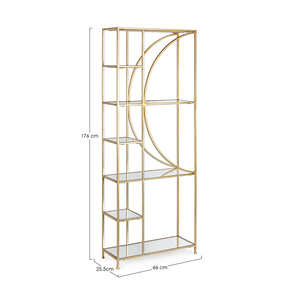 Bibliotecă de sine stătătoare din oțel și rafturi de sticlă cu design elegant.