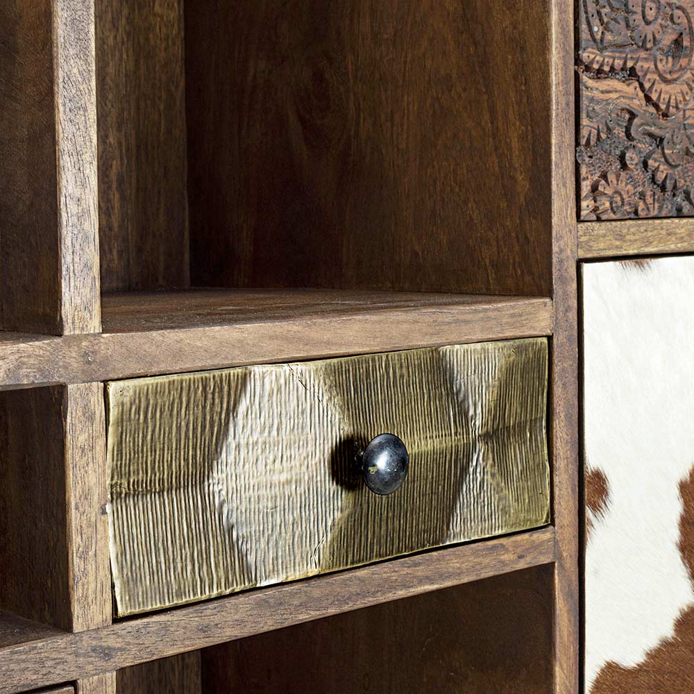 Bibliotecă din lemn de mango cu uși reciclate și mânere din oțel.