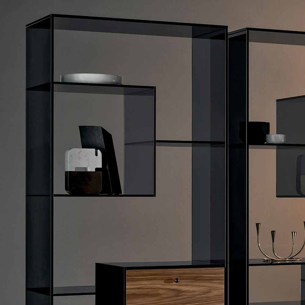 Această bibliotecă cu afișaj se caracterizează prin designul său hotărât și elegant, realizat în întregime din sticlă afumată.