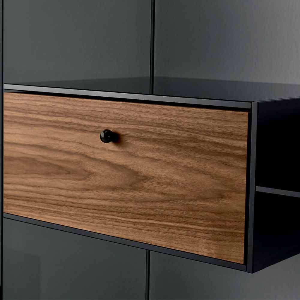 Este inclus un sertar din lemn de nuc canaletto cu un buton de finisaj metalic, care poate fi poziționat după cum doriți în cele două compartimente de referință. Sarcina admisibilă pentru fiecare raft este de 15 kg.