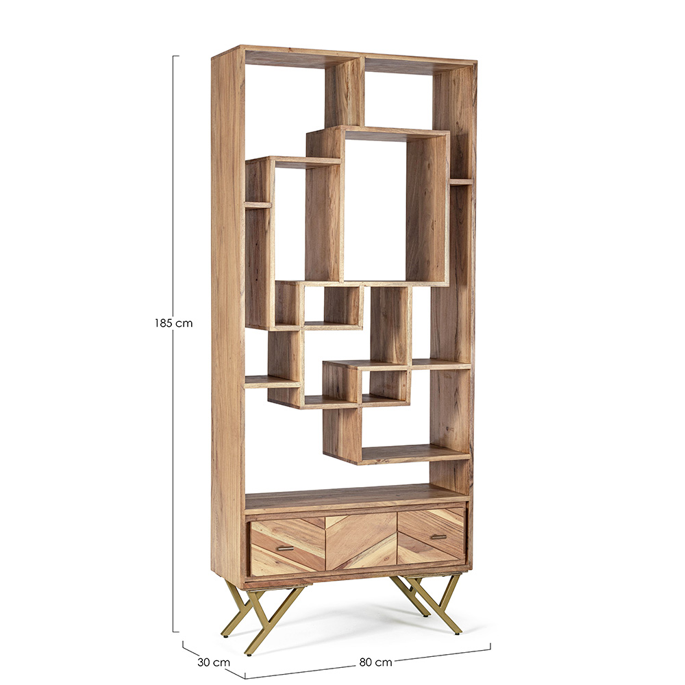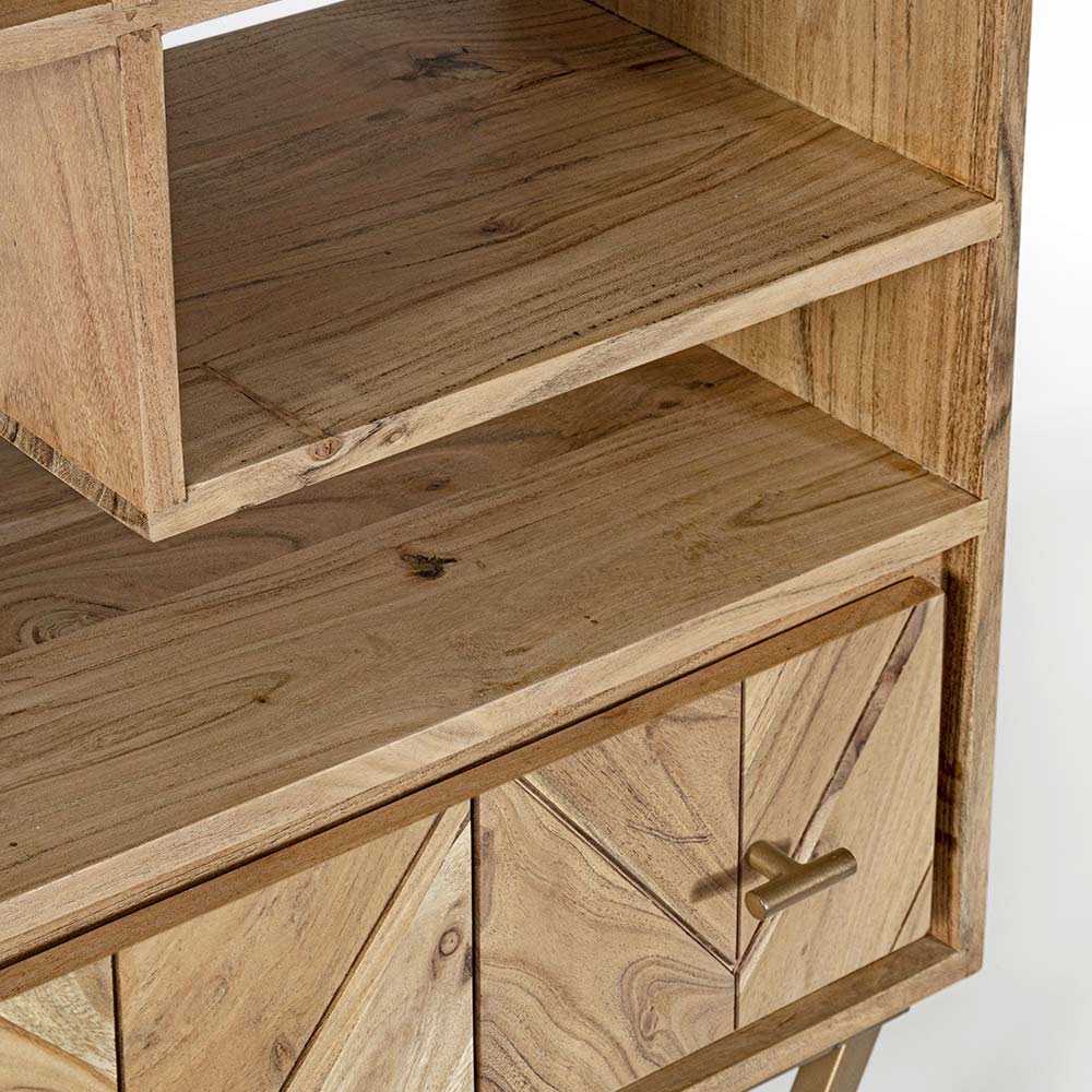 Această bibliotecă de living are o structură din lemn de salcâm cu spate din placaj și interiorul sertarelor, finisaj pe bază de lac poliuretan. Picioare din oțel acoperit cu pulbere epoxidică pentru asamblare.