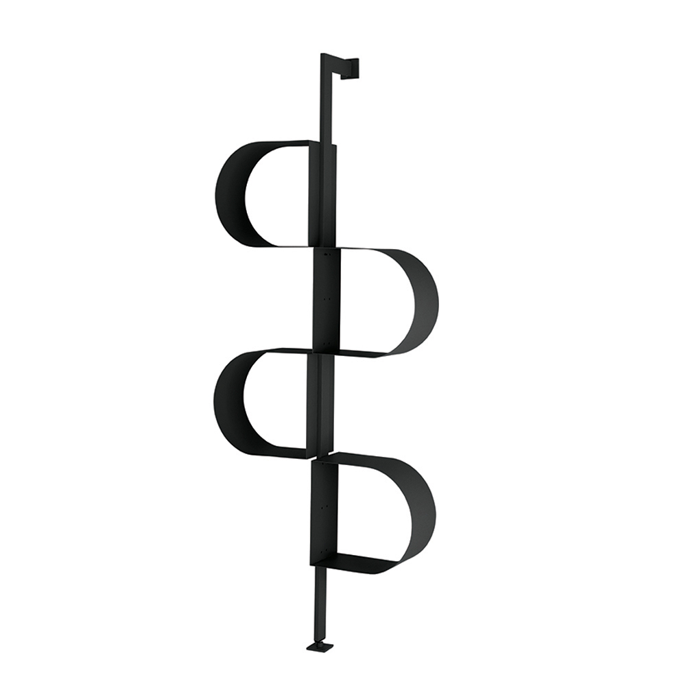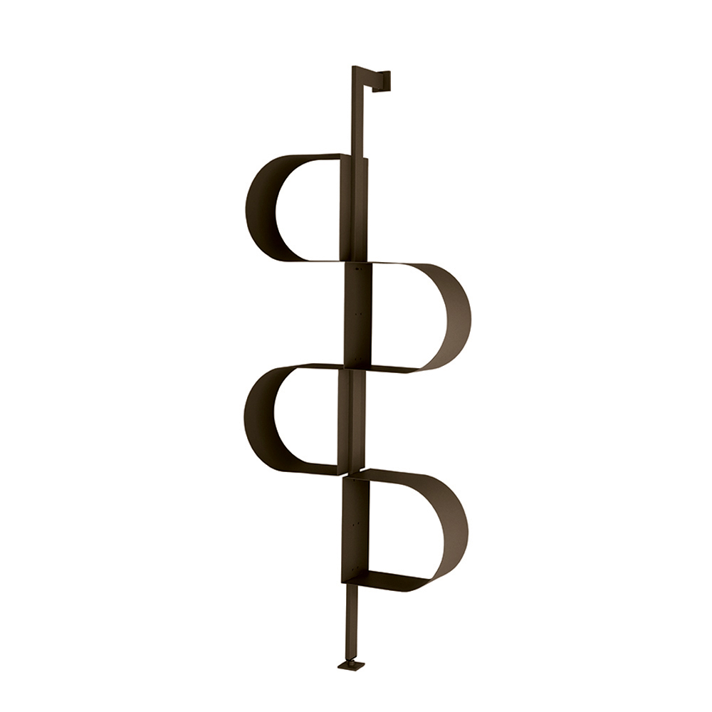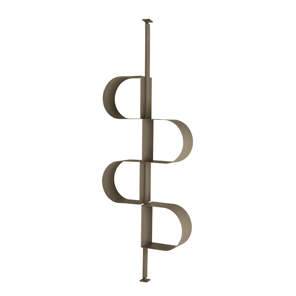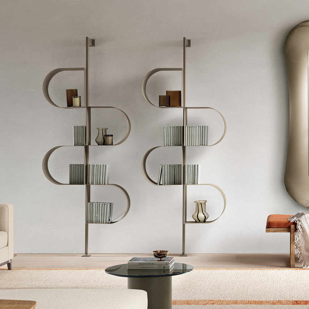 Fabricată din metal vopsit , biblioteca se dezvoltă vertical cu o structură care amintește de o panglică continuă , creând o secvență ritmică de compartimente de depozitare . Acest design particular vă permite să organizați cărți și obiecte decorative într-un mod original și armonios.