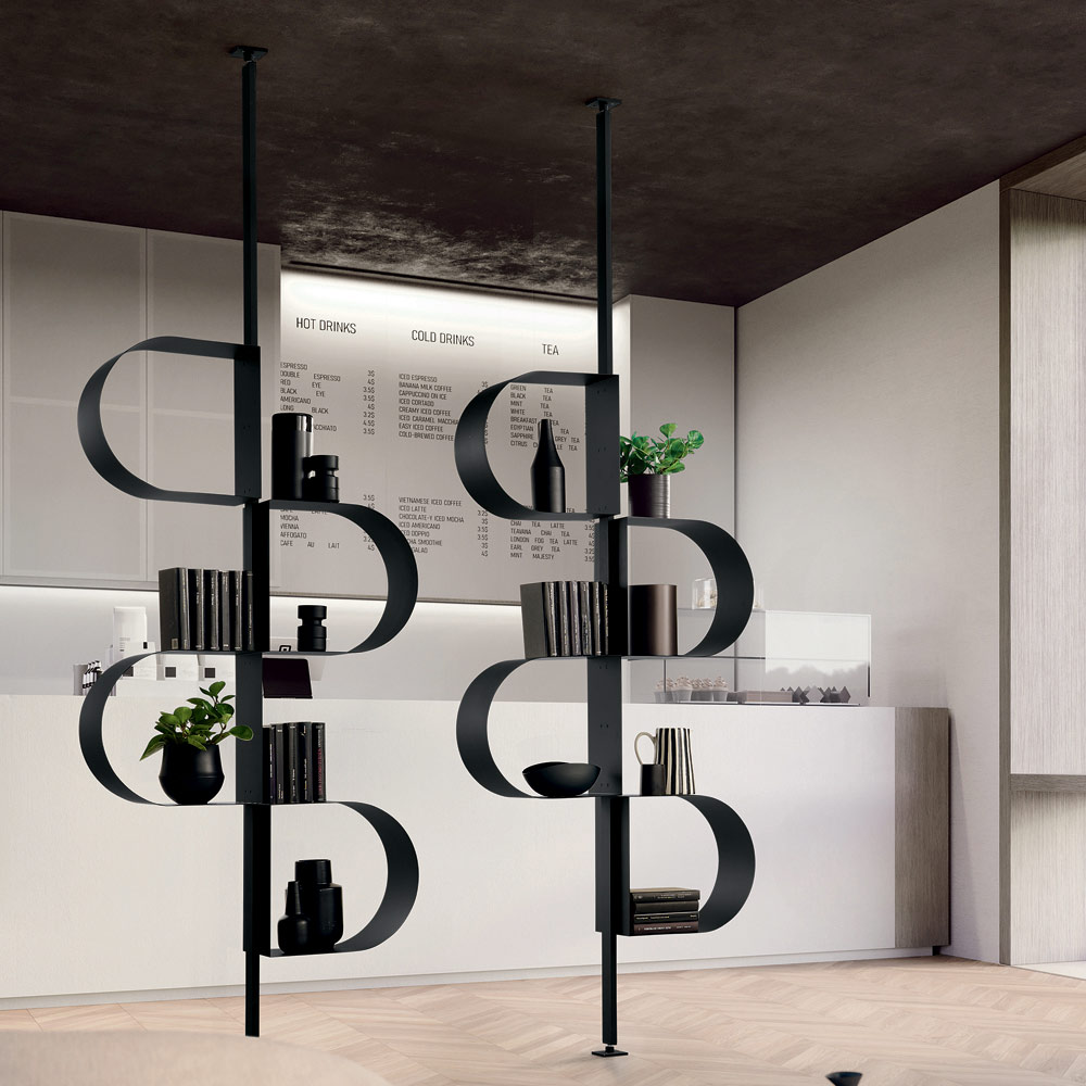 Versatilă și funcțională, biblioteca este disponibilă cu montare pe perete sau pe tavan . Versiunea cu montare pe tavan poate fi folosită și ca separator de cameră, creând separații subtile fără a îngreuna spațiul.