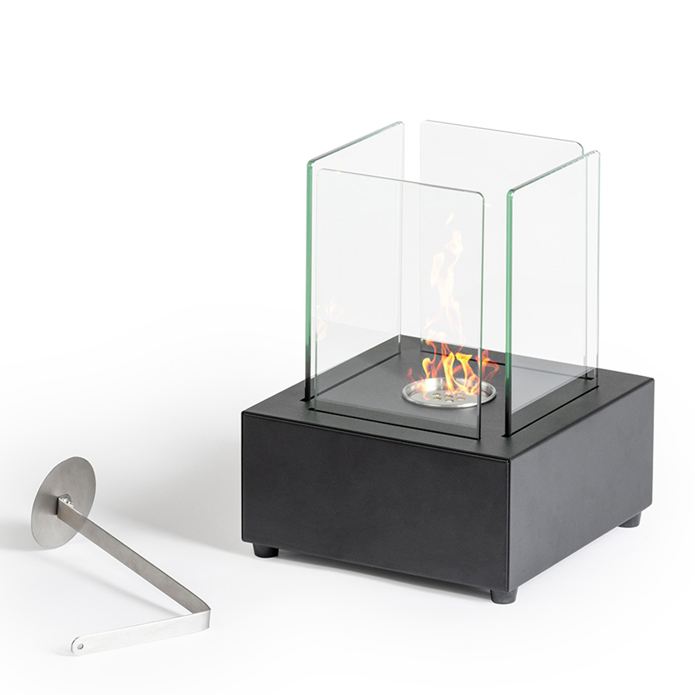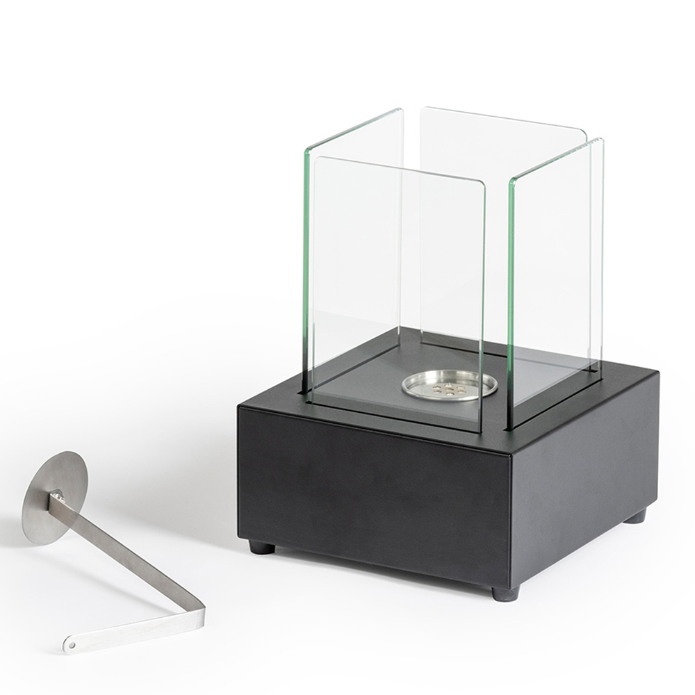 Biosemineu de masa din metal vopsit negru cu sticla securizata care protejeaza flacara de eventualele rafale de vant, evidentiind-o, complet cu instrument de control al flacarii. Un accesoriu de mobilier minimal care este apreciat și atunci când este oprit, deoarece completează stilul mediului minimal și contemporan într-un mod rafinat și elegant . Ideal și pentru încălzirea zonelor exterioare.