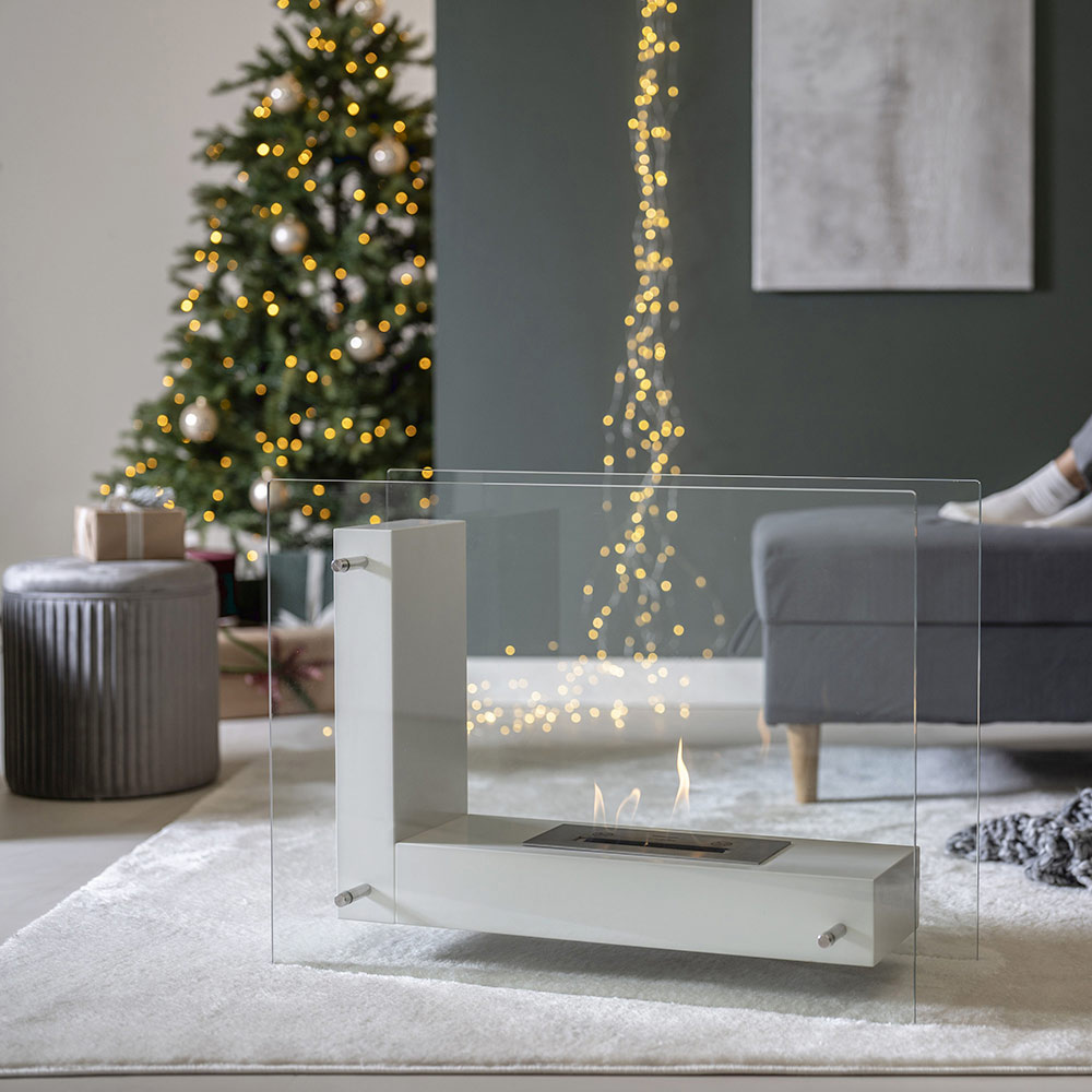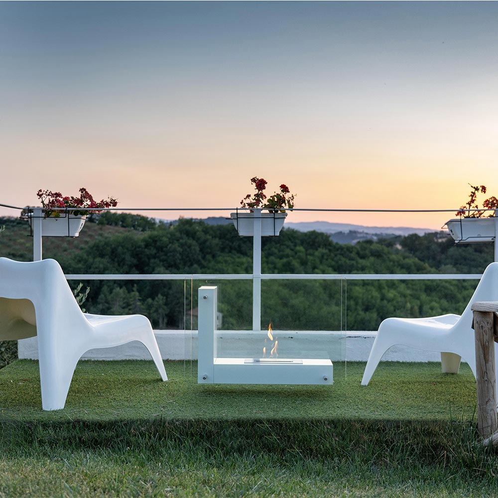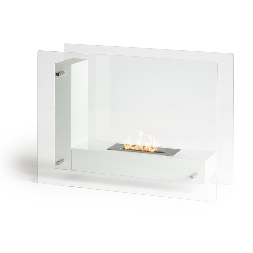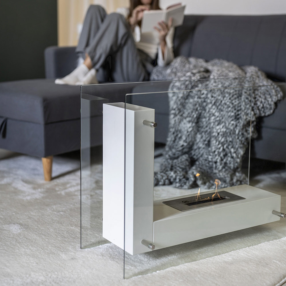 Biosemineu de pardoseala pentru uz interior sau exterior din metal vopsit alb si sticla transparenta securizata util pentru protejarea flacarii de eventualele rafale de vant, evidentiind-o. Complet cu instrument de control al flăcării și manual de instrucțiuni. Un accesoriu de mobilier elegant și funcțional , ideal pentru încălzirea mediilor casnice și contractuale atât în interior cât și în exterior. Stilul său minimal și rafinat îl face de asemenea apreciabil atunci când este oprit deoarece completează spațiul înconjurător prin a nota de personalitate si rafinament .