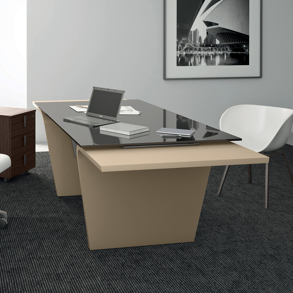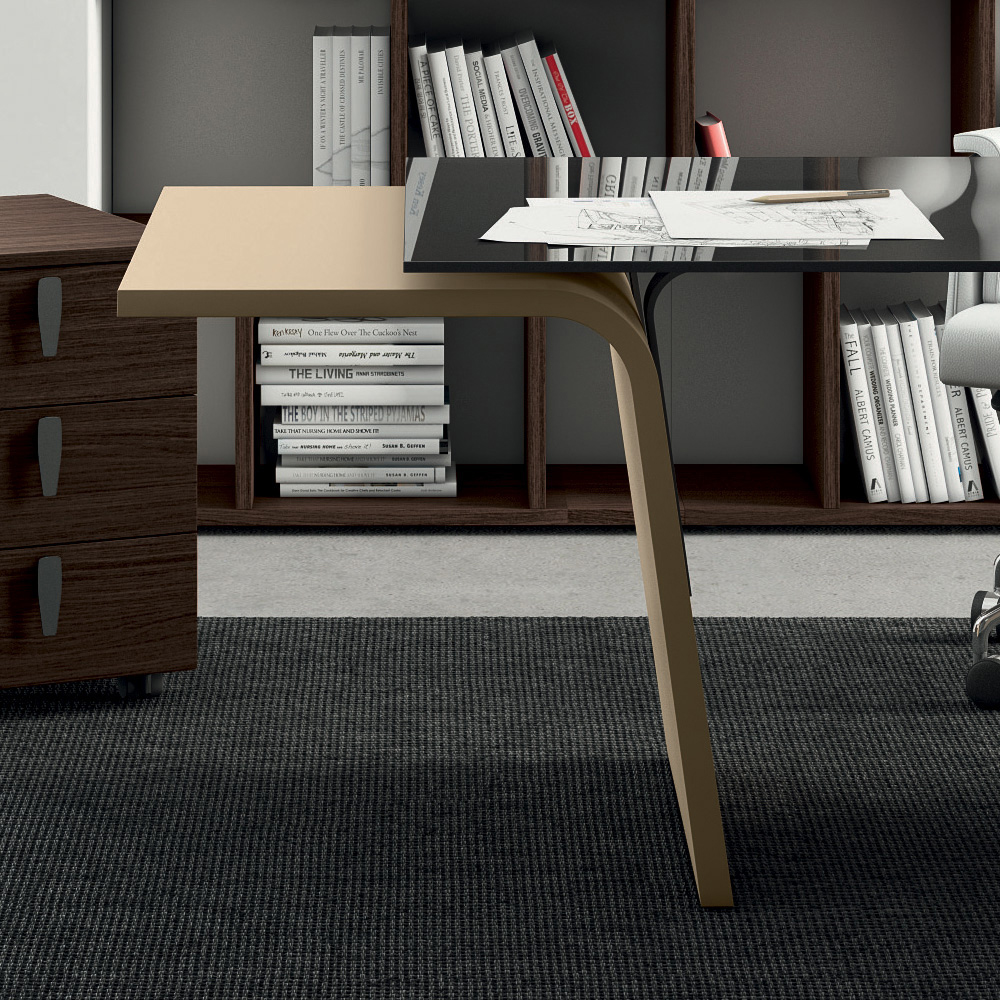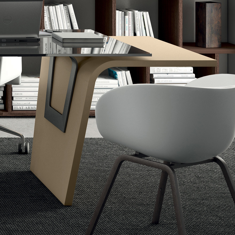 Acest birou este format dintr-un blat din sticlă în finisaj castaniu, susținut de o pereche de picioare nealiniate din Mdf lacuit în finisaj Bej Gri RAL 1019, toate unite printr-o pereche de console din fier vopsit în finisaj lustruit.