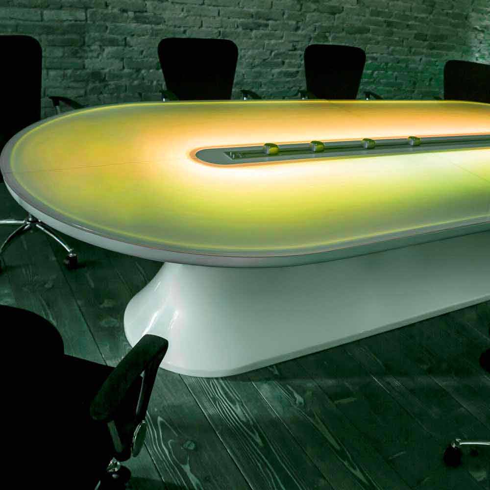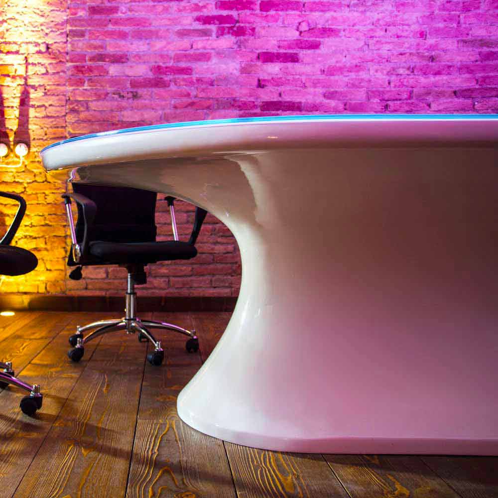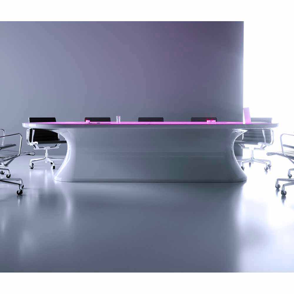 Material: adamatx si sticla. Masa de intalnire de design, eleganta si tehnologie. Cu forme sinuoase și spații generoase, tabelul de informații este o adevărată operă de artă. Personalizat în culori și dimensiuni. Pe langa aspectul estetic, tabelul de info este si tehnologic avansat, datorita cromoterapiei luminilor RGB de sub sticla, dar mai ales datorita barei electrificate amplasata in centrul mesei, permitand orice tip de conexiune din orice locatie. .