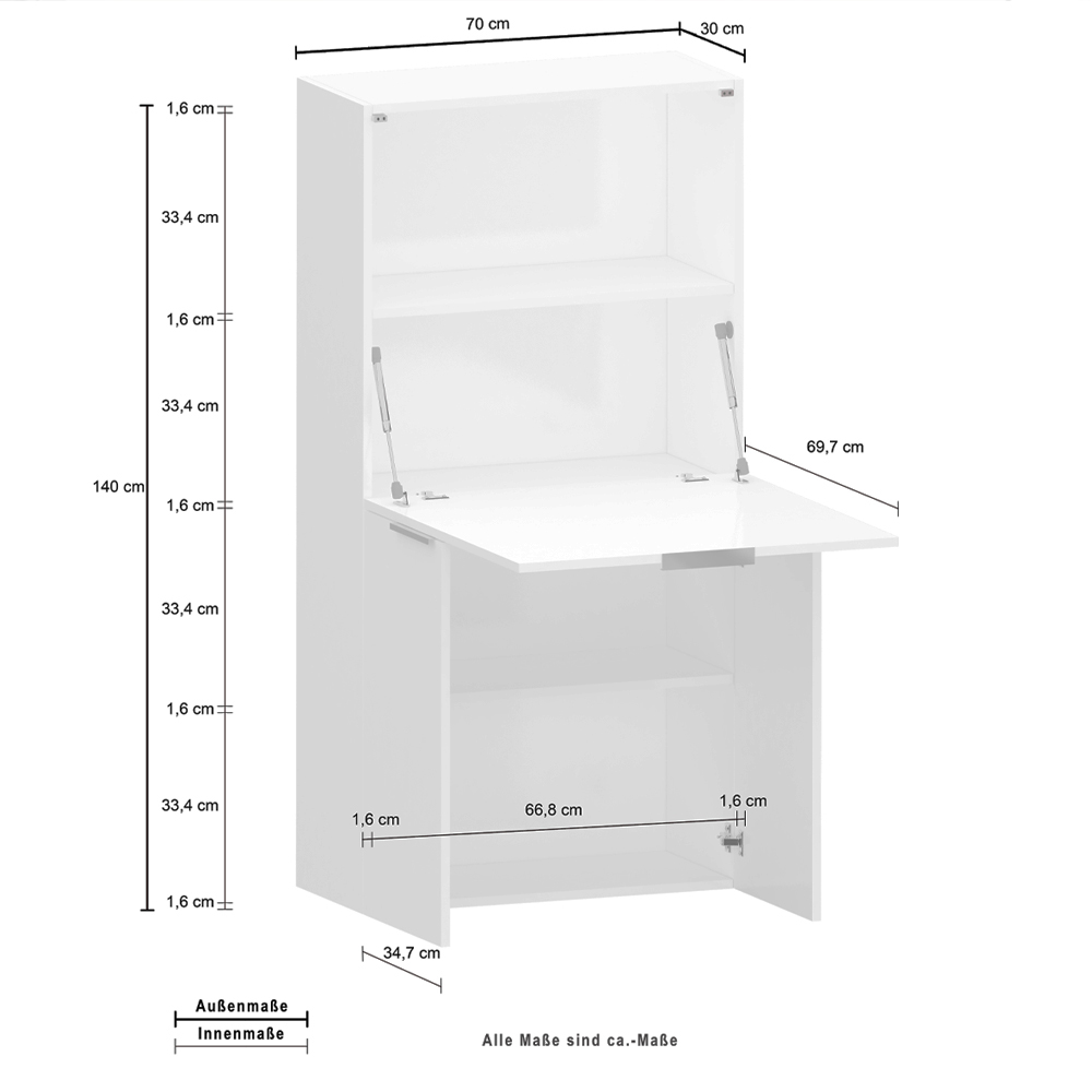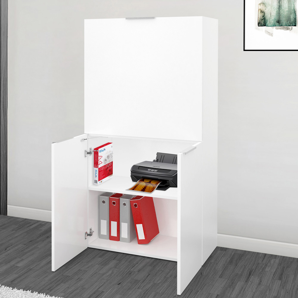 o ușă superioară cu clapă care acționează și ca blat de birou atunci când este deschisă în jos prin utilizarea practică a unui mâner.