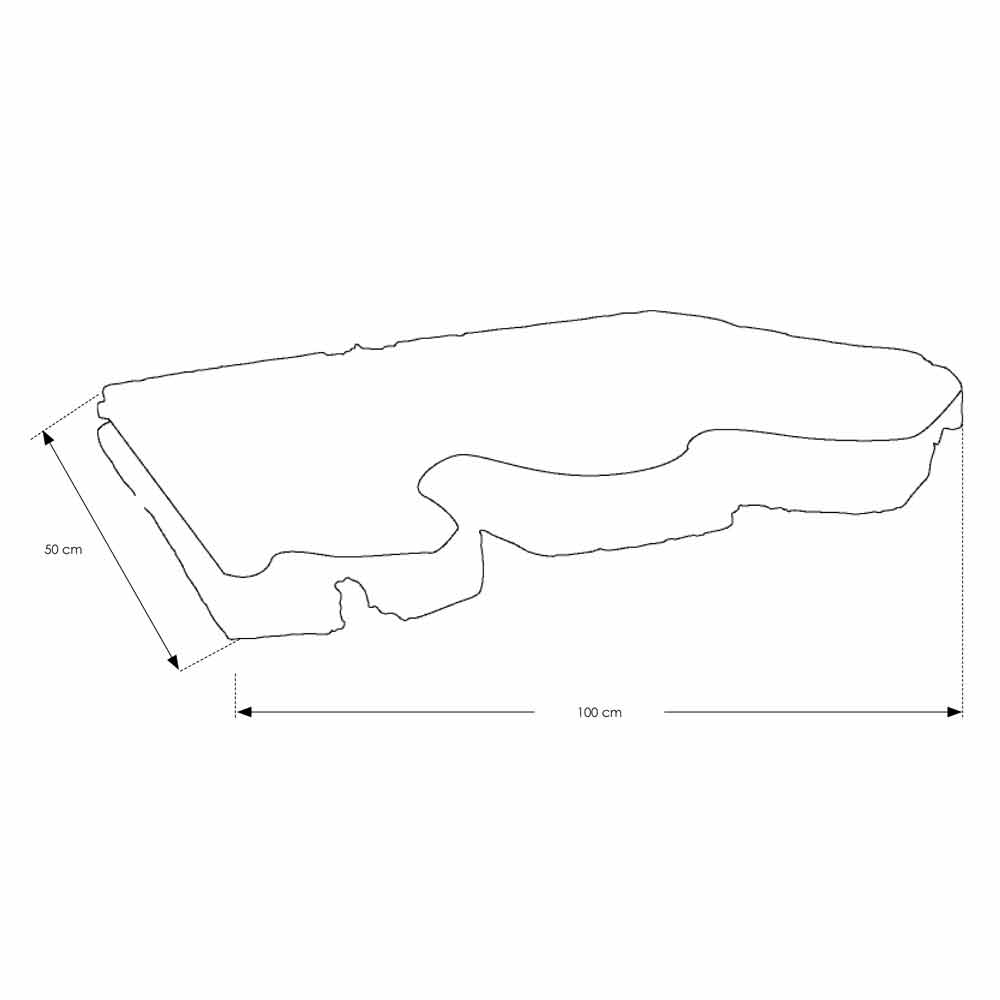 Blat din tec masiv de formă și dimensiune variabile. Rafturi suport la cerere. Fiind o piesă unică și irepetabilă, dimensiunile indicate sunt aproximative.