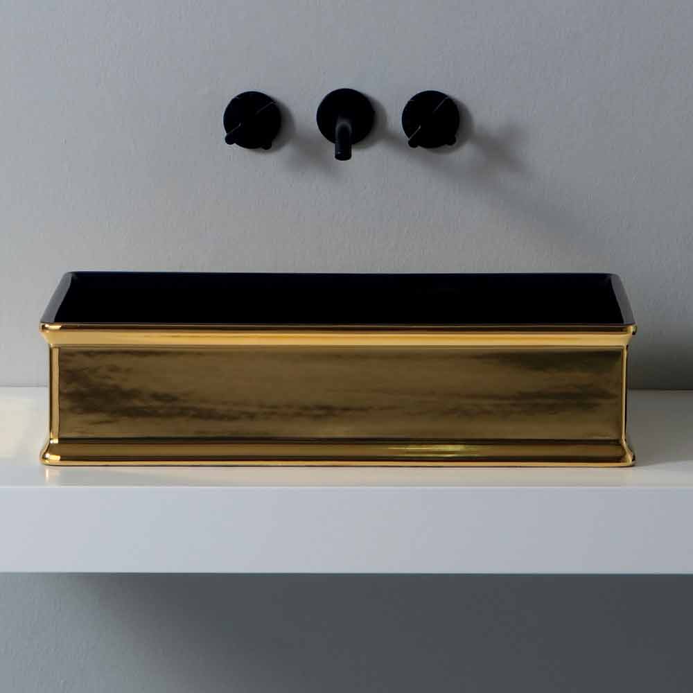 Debora este lavoarul de blat fabricat manual în Italia de către meșteri meșteri; caracterizată printr-o structură ceramică cu finisaj în două tonuri: auriu și negru.