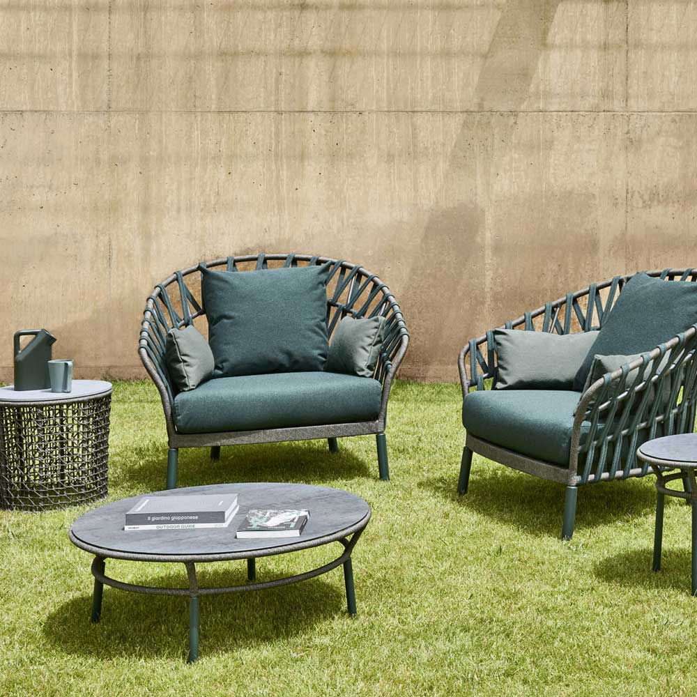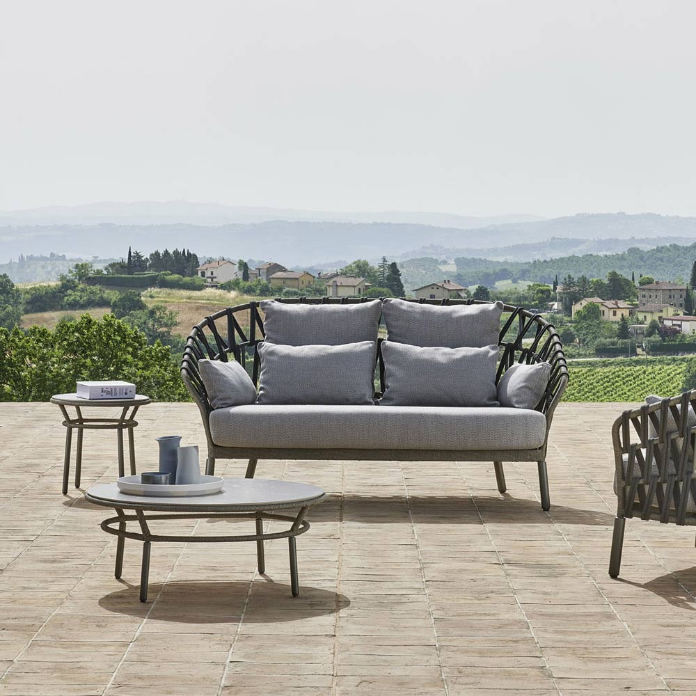 Masă rotundă de grădină cu structură din aluminiu și țesut frânghie Made in Italy.