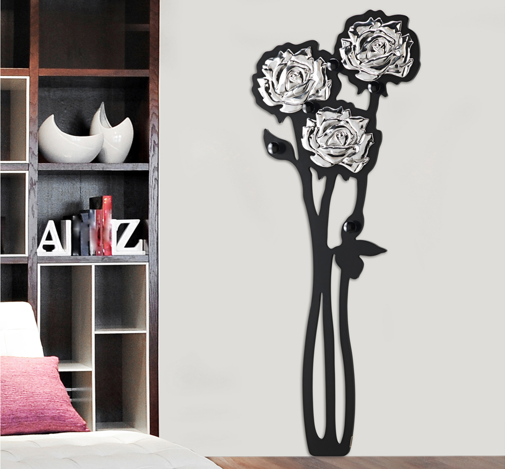 Un exemplu ar putea fi pictura Petuniaby Viadurini decor cu structură dublă L decorată manual, cu detalii de rășină pe material și element central în relief și finisaj lucios. Combinat cu poza, cuierul romantic Appendirosa este perfect într-o structură în formă de lăcuit negru cu trei trandafiri cromati în relief, cinci butoane negre și finisaj lucios.