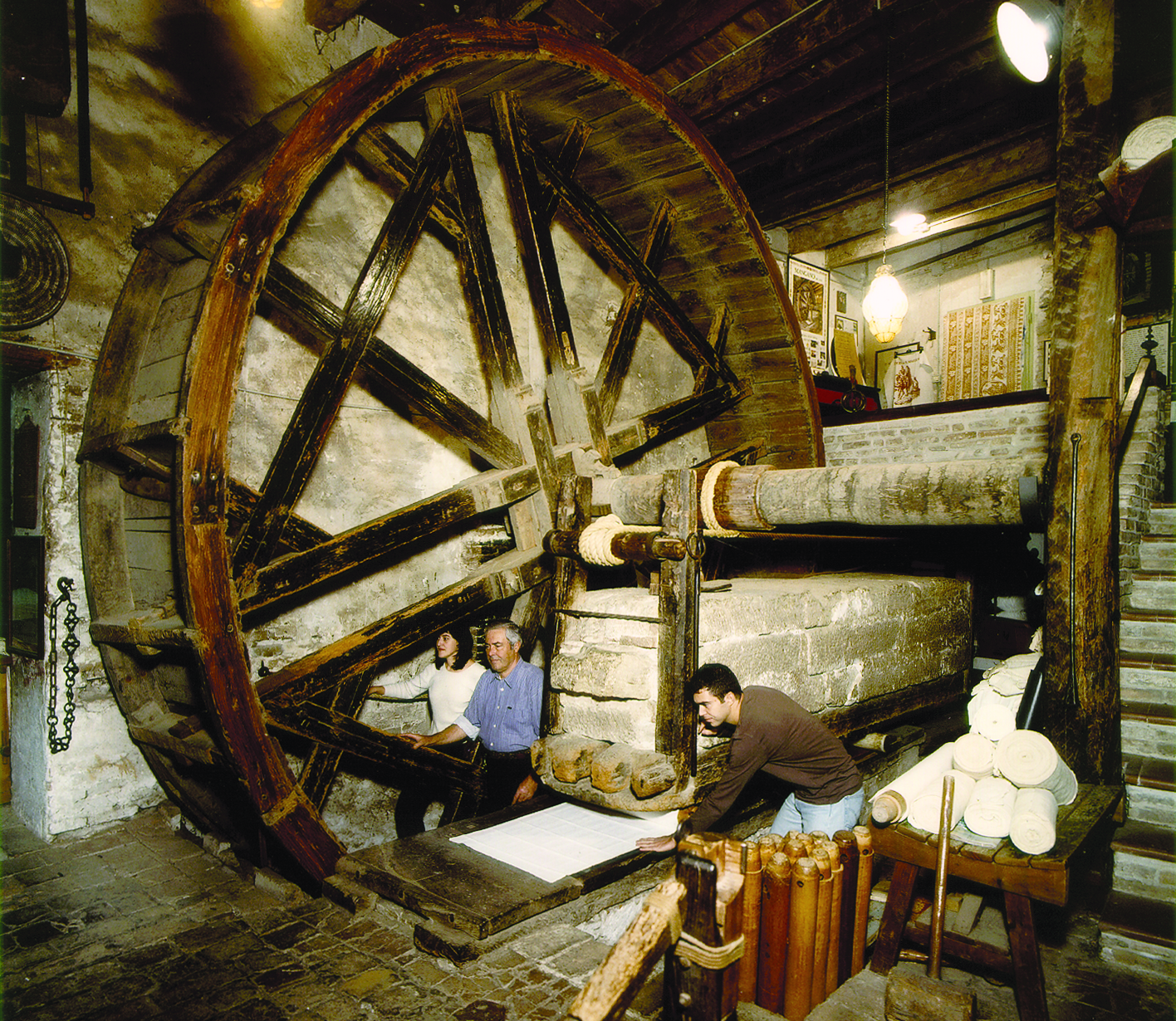 Funcționarea sa se datorează echilibrului dintre roată și bolovan pe partea sa. Roata acționează ca o pârghie și mișcă bolovanul care are sarcina importantă de călcat și compactat pânza. Ambele cântăresc 55 de chintale și, datorită acestui raport perfect, manșoana se mișcă atunci când bărbatul intră la volan cu propria sa greutate rupe echilibrul. Pânza este înfășurată în jurul unor role de lemn numite grinzi. Rolele sunt poziționate sub bolovan și urmează mișcarea pietrei, înainte și înapoi, permițând astfel călcarea. Este singura greutate a omului care face ca roata să se miște, facilitând astfel această operație numită plin.Chiar și astăzi, înainte de a imprima pânza și după imprimarea acesteia, procedăm cu această rotire a roții pentru a înfrumuseța țesăturile și a obține un rezultat excelent.