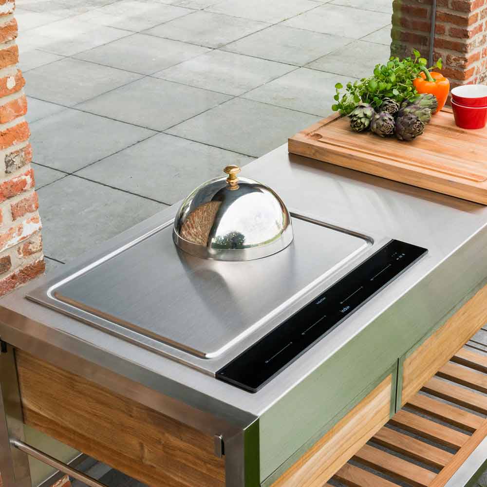 Bucătărie exterioară pe roți din inox și lemn de tec, două dimensiuni de design modern cu plăci interschimbabile.