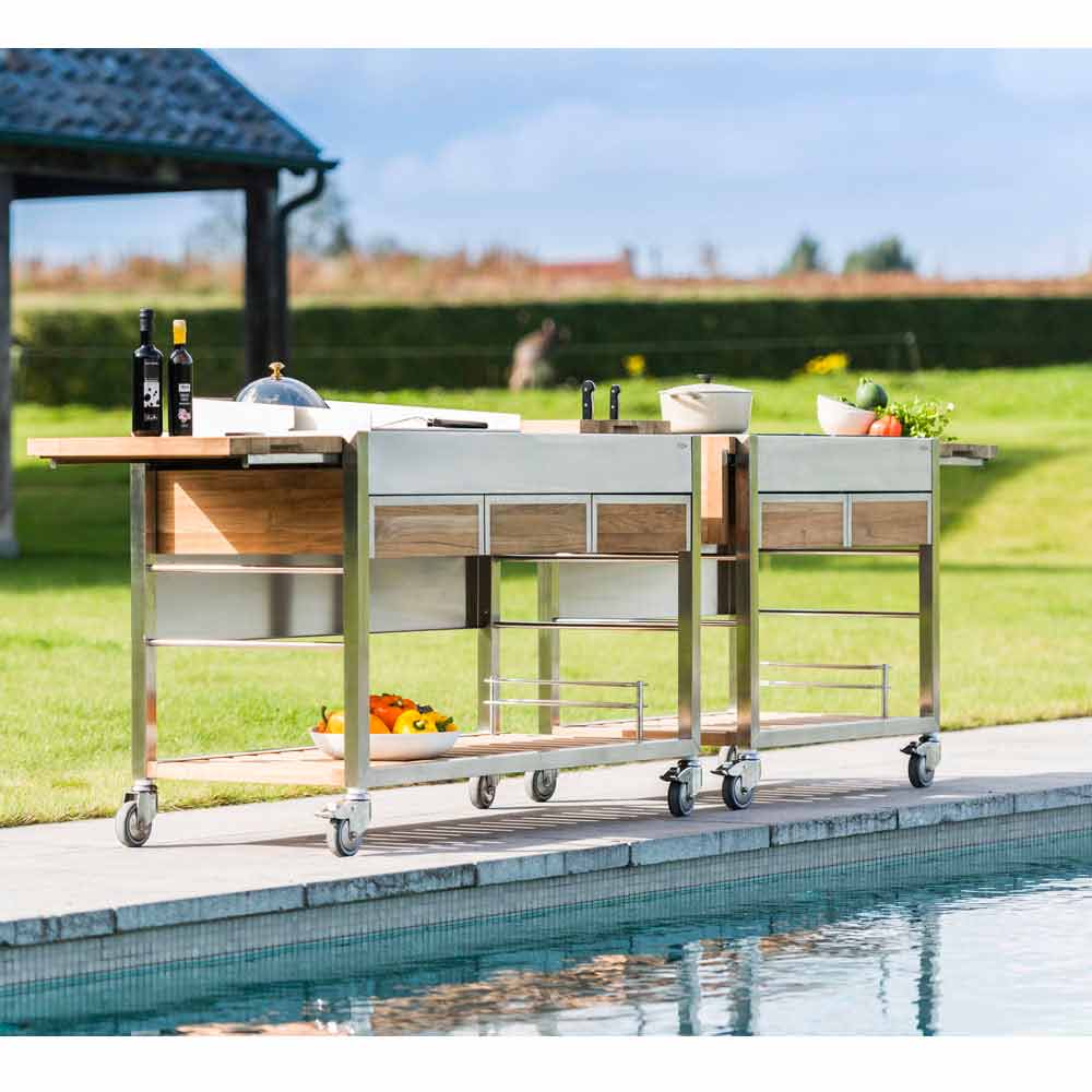 Este o bucatarie de exterior pe roti caracterizata printr-o structura robusta ce foloseste otel inoxidabil periat si lemn masiv de Teak , pe care o poti amplasa oriunde vrei: in gradina, pe terasa sau langa piscina, pentru un efect luxos si trendy.