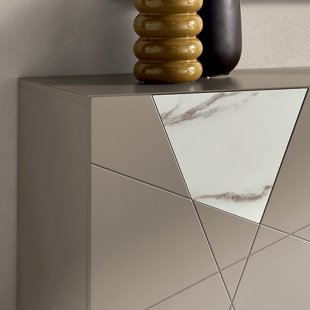 Structura este realizată dintr-o ramă din lemn melaminat și uși din MDF pantografat , cu gravuri decorative care se intersectează într-un design geometric elegant. Inserțiile de sticlă cu efect de marmură îmbogățesc suprafața, creând o interacțiune sofisticată de grafică și materiale.