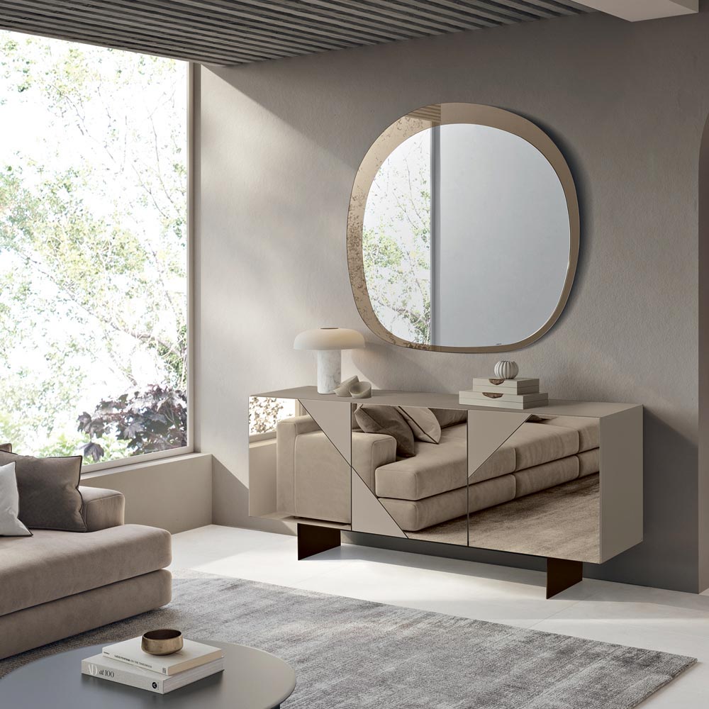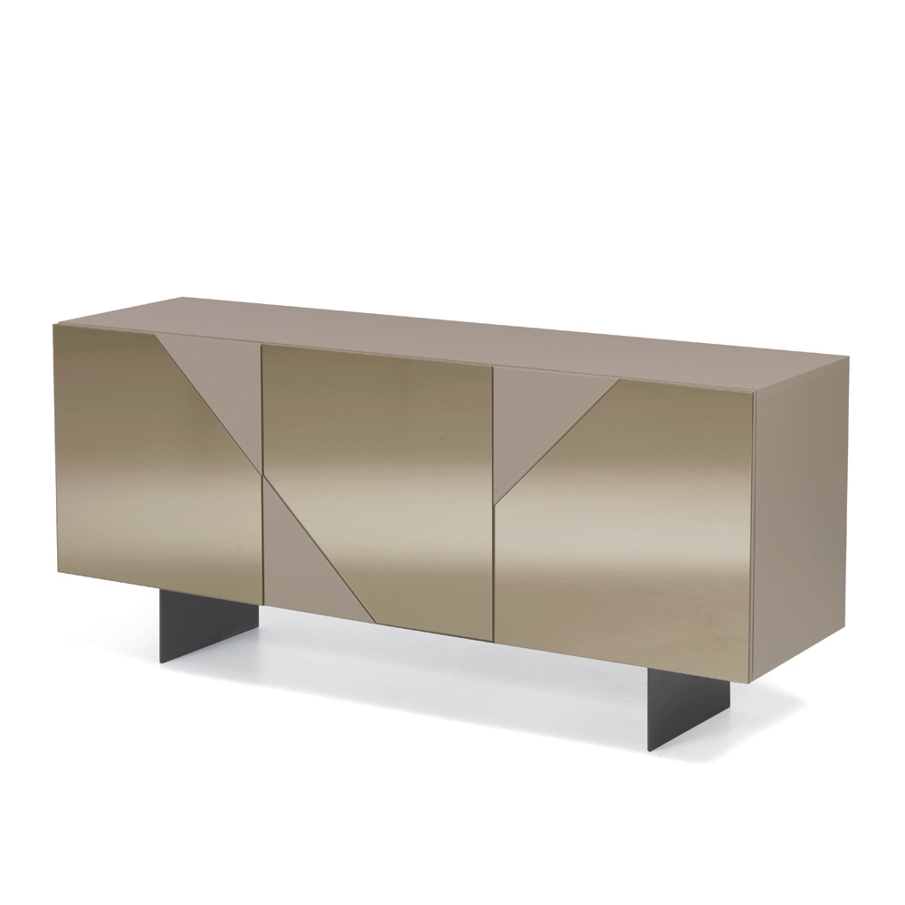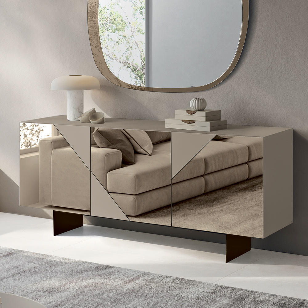 Ușile din MDF sunt acoperite cu sticlă oglindită , care alternează suprafețele lucioase și mate , creând un joc geometric rafinat ce captează lumina și oferă profunzime vizuală. Acest material contrastant face ca bufetul să fie elegant și dinamic, perfect pentru spațiile moderne și sofisticate.