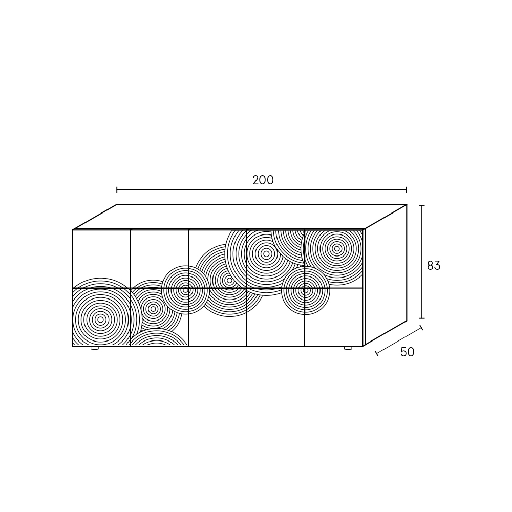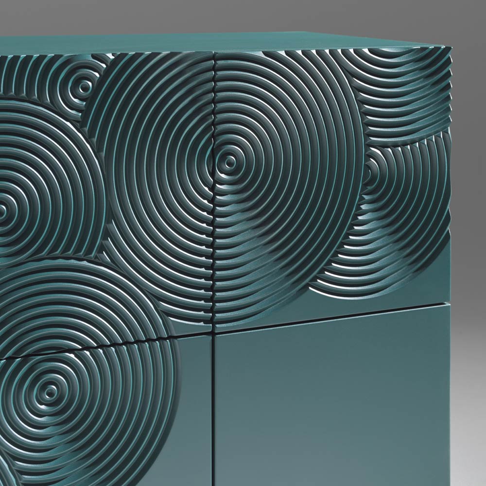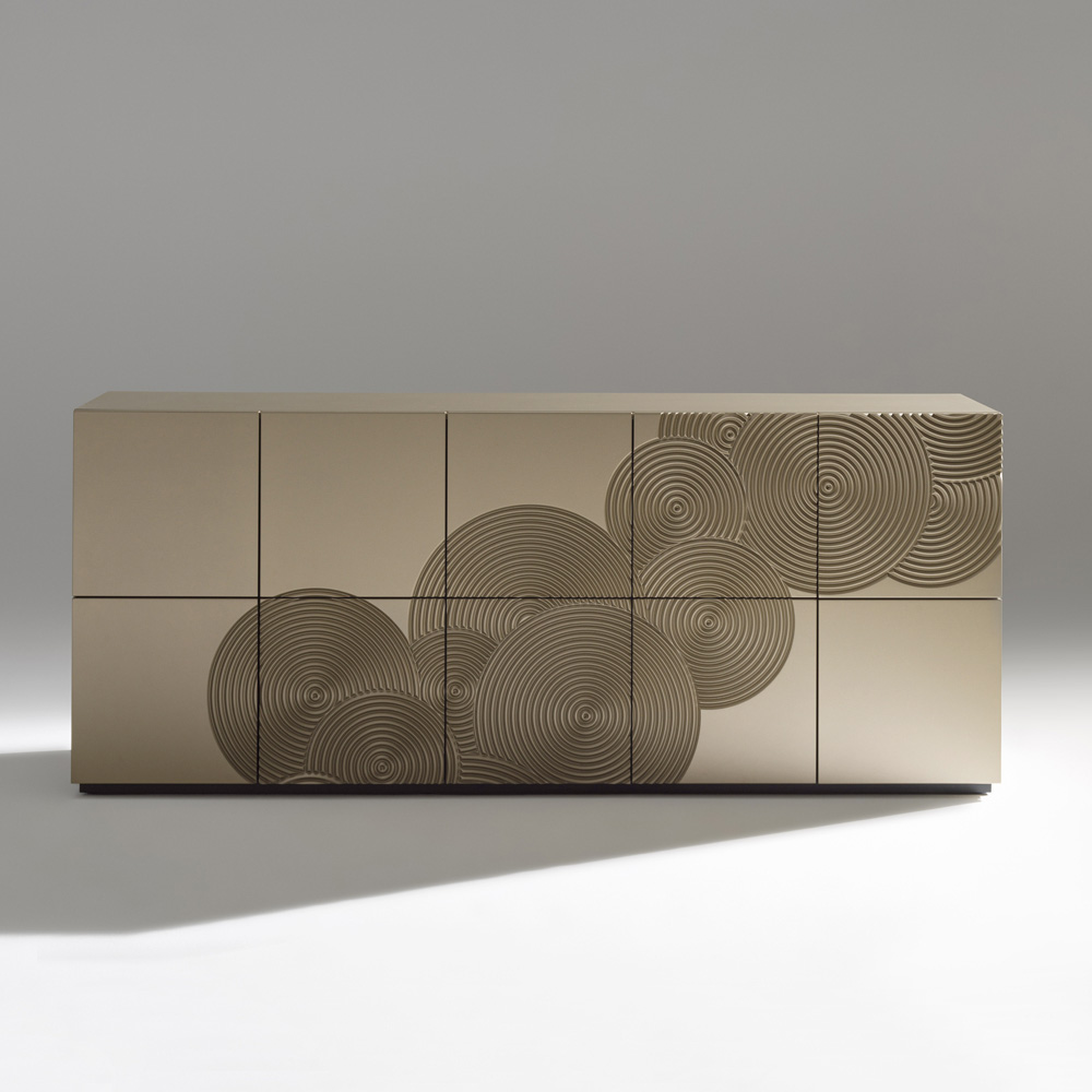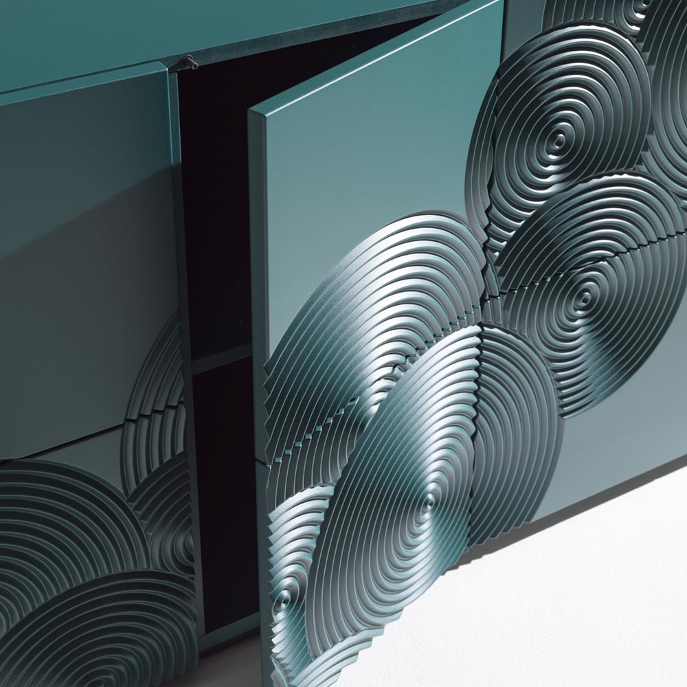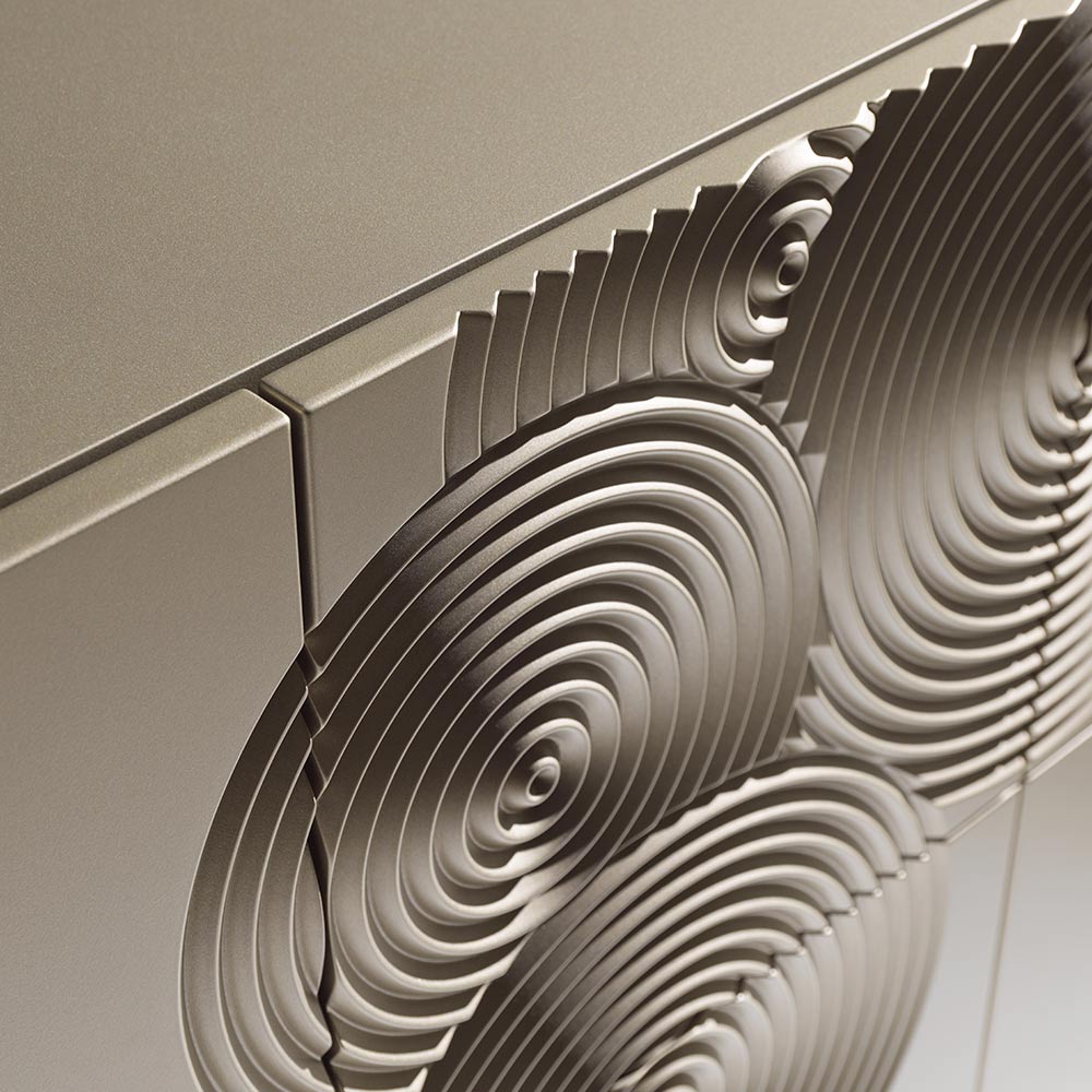 Un bufet cu un impact vizual puternic, caracterizat printr-o decorațiune rafinată gravată cu un motiv circular și finisată în întregime manual , capabilă să creeze jocuri sugestive de lumini și umbre pe suprafață.