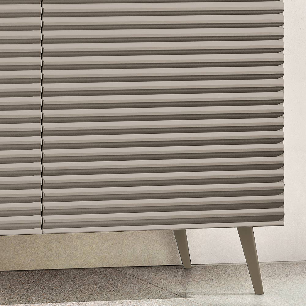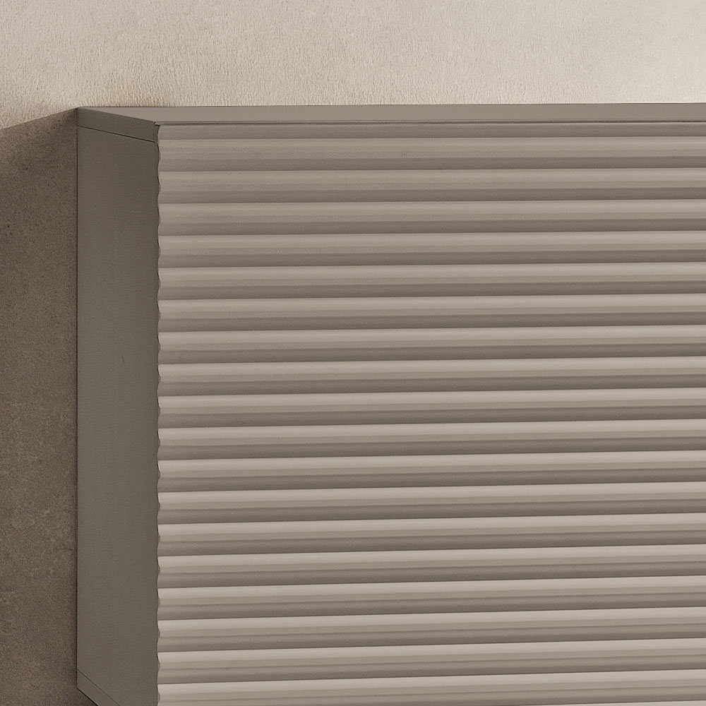 Ușile din MDF acoperite cu PVC prezintă un design cu dungi orizontale în relief care adaugă profunzime și mișcare suprafeței, creând un efect grafic elegant. Corpul melaminat asortat completează designul cu un efect rafinat ton pe ton , făcând compoziția armonioasă și modernă.