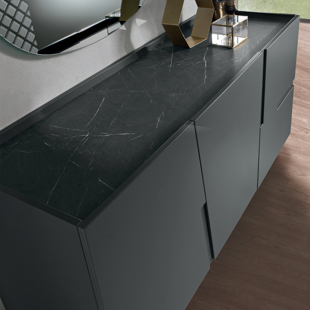 Structura este realizată cu un corp din melamină și uși din MDF lăcuit , care creează o suprafață uniformă și elegantă. Designul este înfrumusețat cu inserții decorative și blaturi contrastante , disponibile în finisaje precum efect de marmură , efect de tec sau oglindă din bronz , care adaugă profunzime și caracter compoziției.
