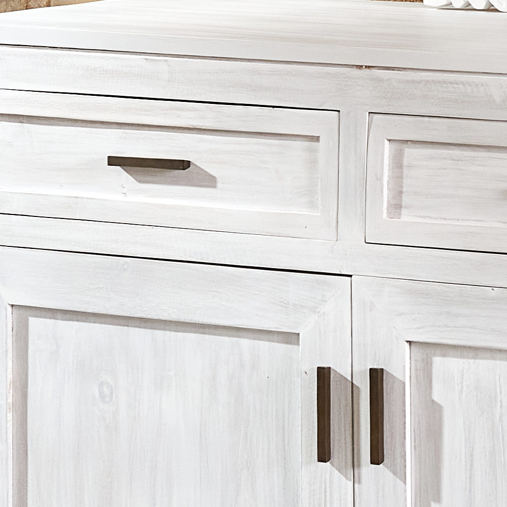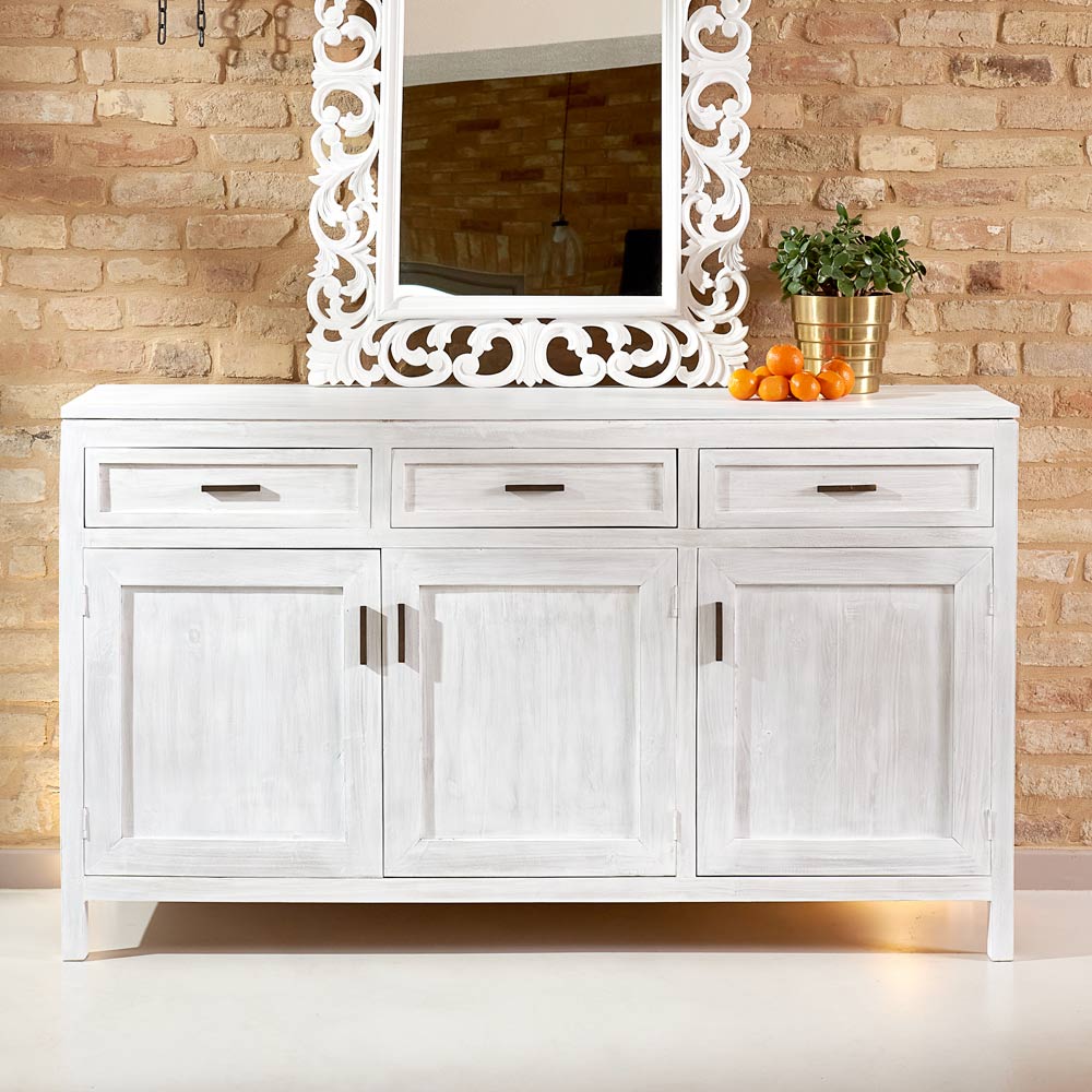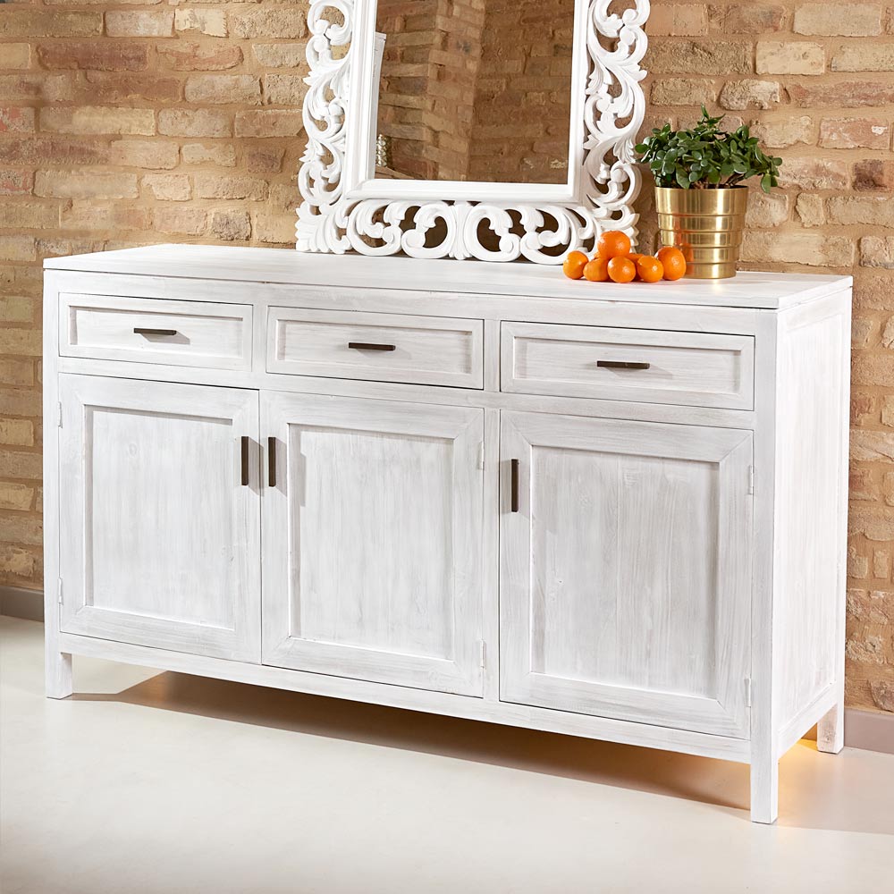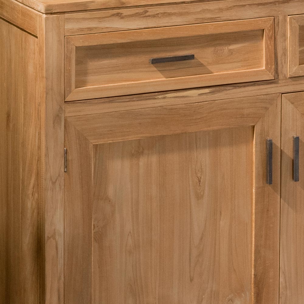 Acest bufet din lemn masiv de tec este o piesă de mobilier atemporală și autentică, ideală pentru a îmbunătăți spațiile precum bucătăria, sufrageria sau livingul. Textura naturală a lemnului și măiestria lucrării conferă căldură și eleganță, făcând fiecare piesă unică.