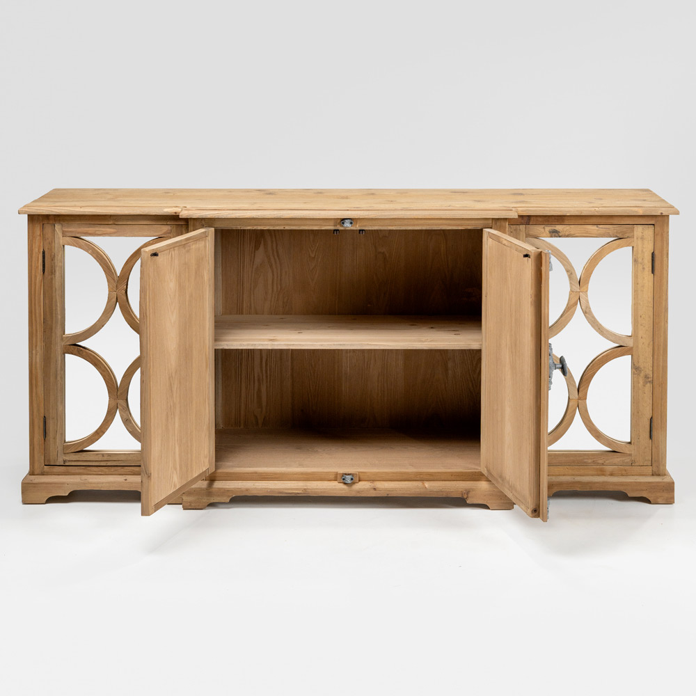 Acest bufet din pin natural învechit este o piesă de mobilier remarcabilă, cu uși elegante cu oglinzi care adaugă luminozitate și profunzime camerei. Finisajul învechit sporește textura lemnului, evidențiind fibra, nodurile și neregularitățile naturale.