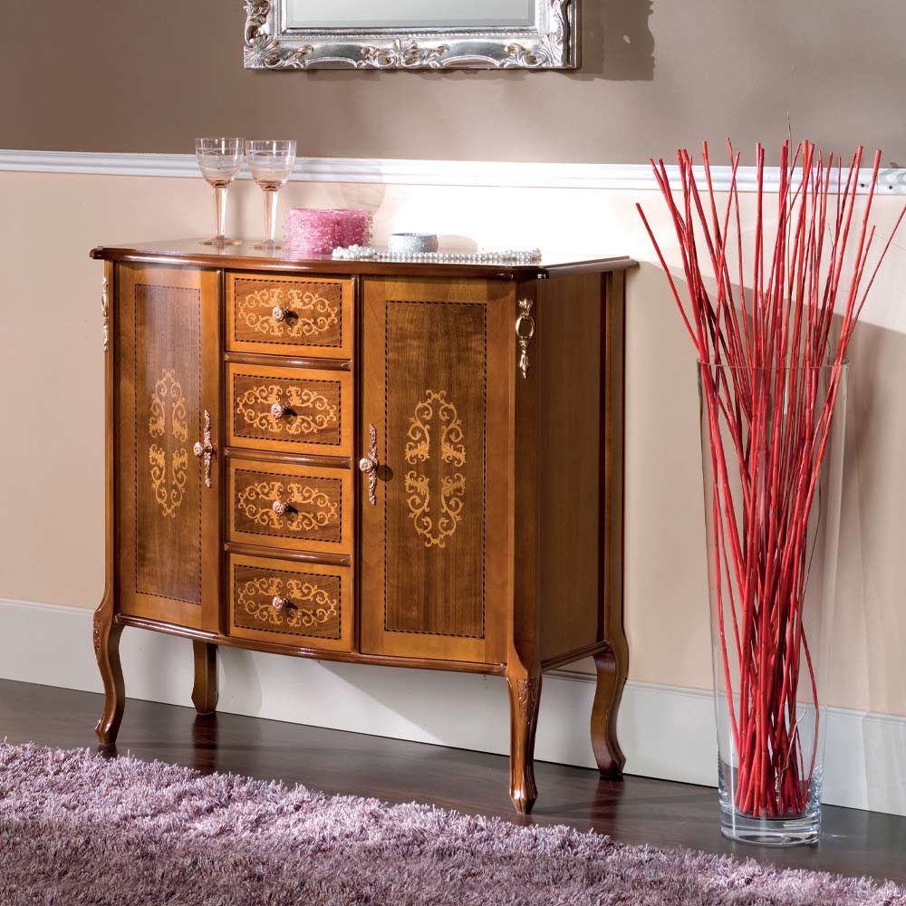 Bufetă de living în stil clasic din lemn finisaj nuc lucios cu incrustații aurii elegante, completată cu 2 uși și 4 sertare practice. O piesă de mobilier unică și rafinată, realizată complet în Italia de meșteri pricepuți , finisată cu înțelepciune și gust pentru eleganță. Producția este realizată folosind materiale fine , iar lucrul este realizat manual cu cea mai mare grijă și profesionalism care distinge produsele Made in Italy .