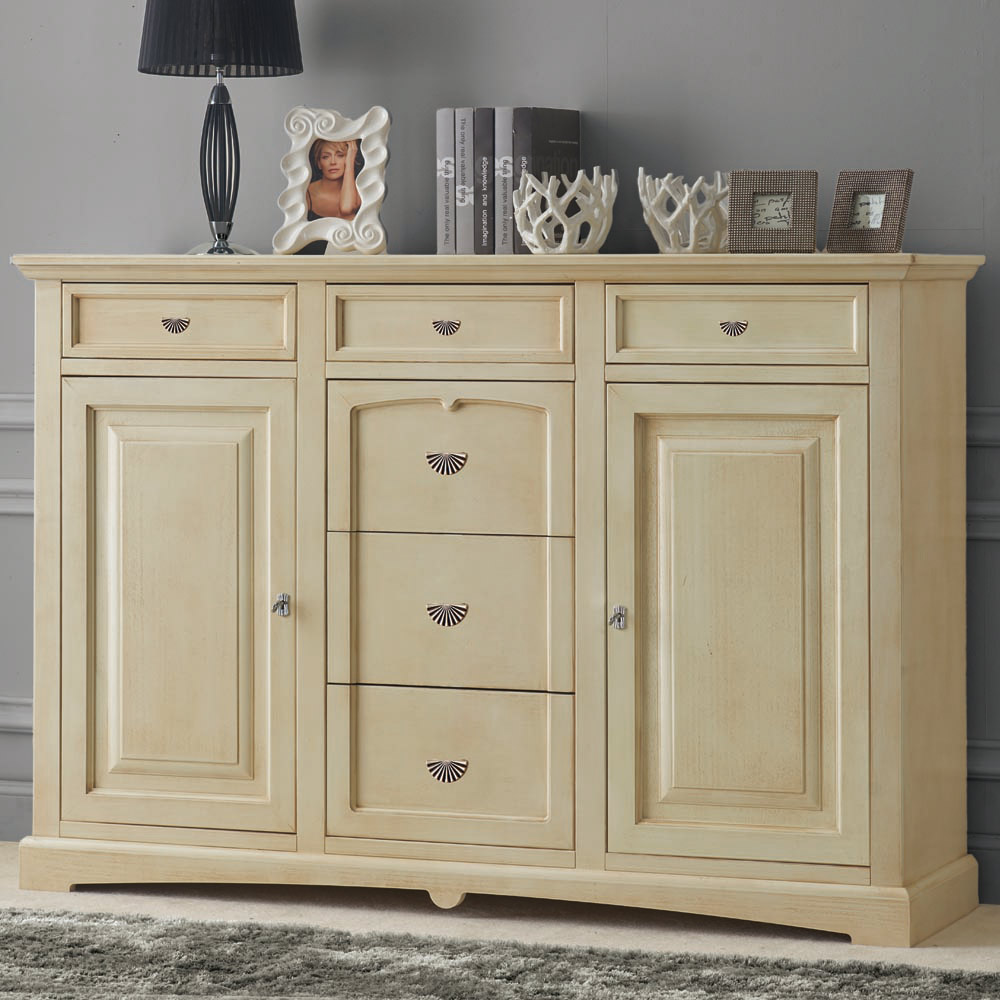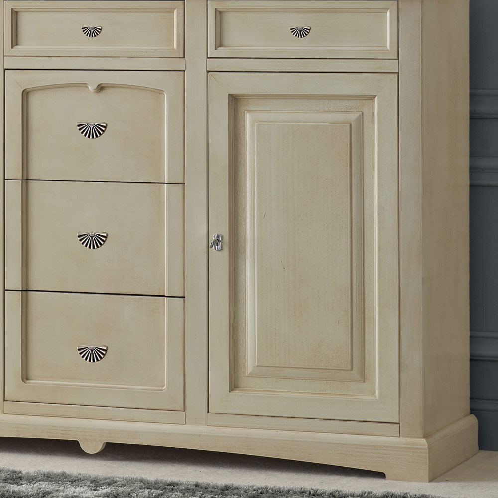 2 uși și 6 sertare. Clasicismul și funcționalitatea sunt echilibrate în acest produs care răspunde nevoilor unui client care dorește să facă ordine și să aibă mereu obiecte la îndemână fără a renunța să ofere camerei o notă unică și atemporală.