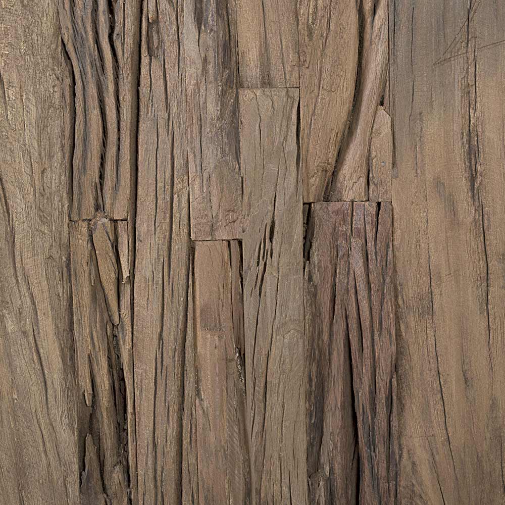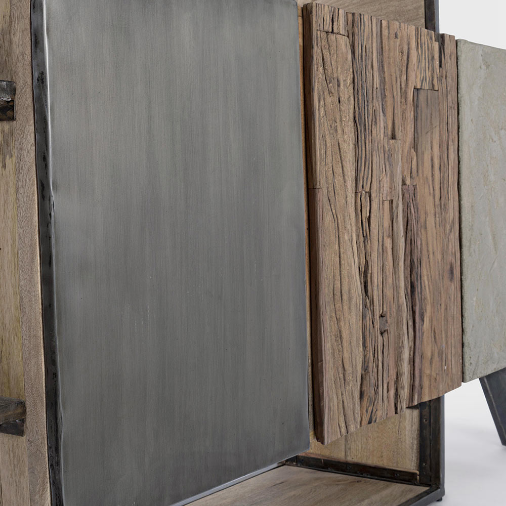 Cele 3 uși sunt realizate din lemn reciclat , tablă de oțel și finisaj din fibră de ciment : particularitatea piesei de mobilier constă tocmai în prezența diblurilor din lemn de diferite specii și culori.