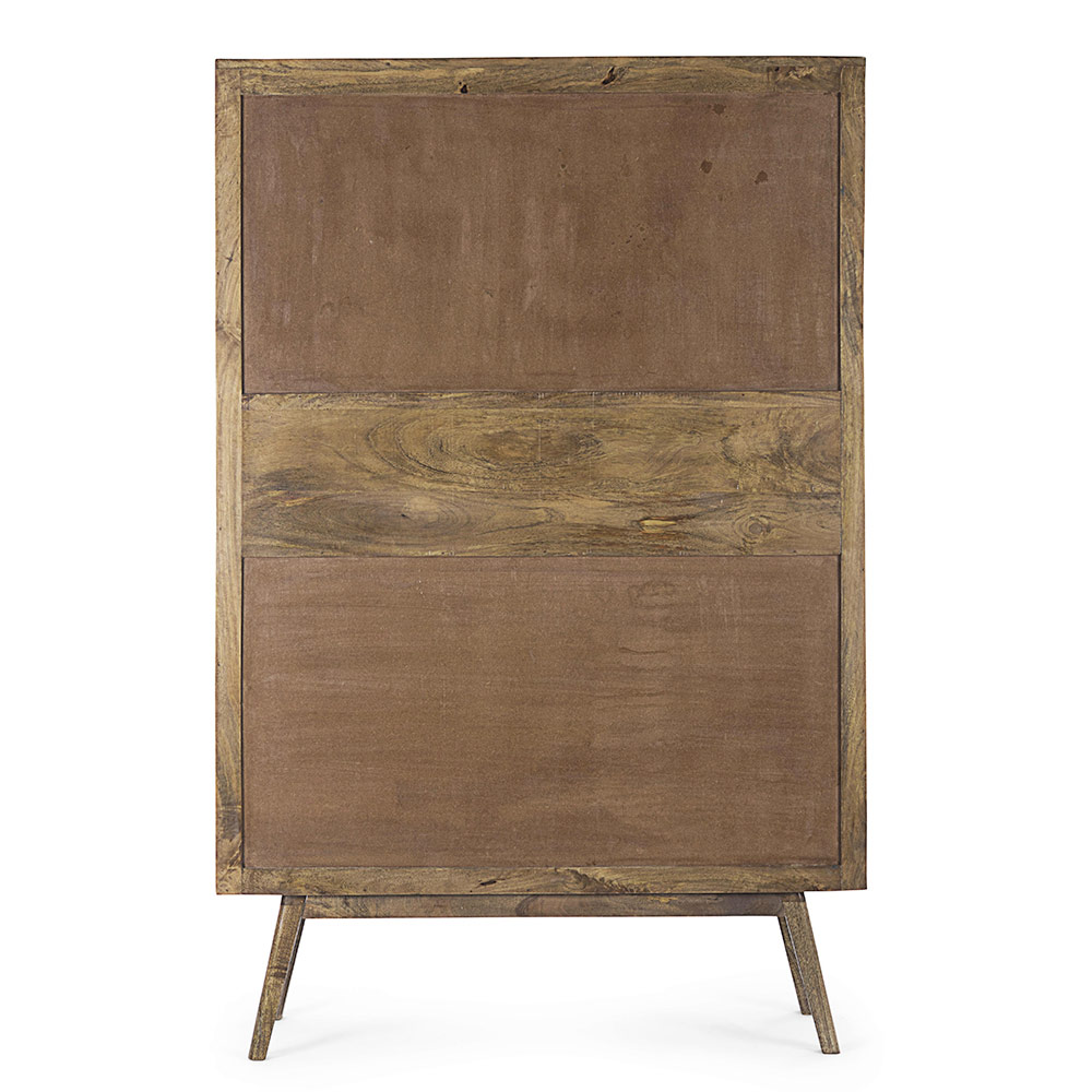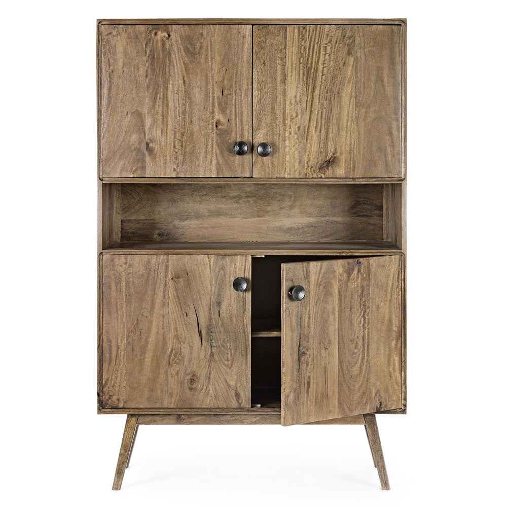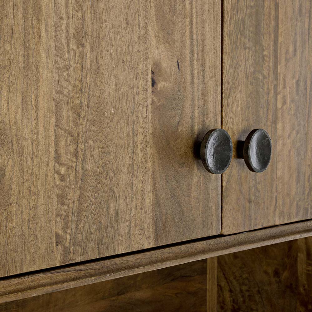 Acest bufet de design pentru living are structură și picioare pentru a fi asamblate din lemn de mango cu finisaj pe bază de apă și spate din MDF. Compartimentul include un raft iar butoanele sunt din otel. Rezultatul este un accesoriu vintage cu aromăetnică.