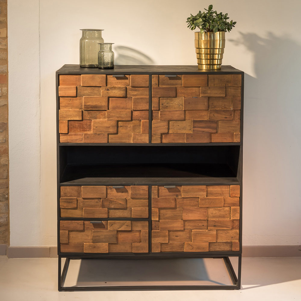 Bufetă de interior realizată cu 3 uși și 2 sertare cu compartiment deschis din lemn reciclat patchwork de culoare cafea naturală și corp din metal negru periat .