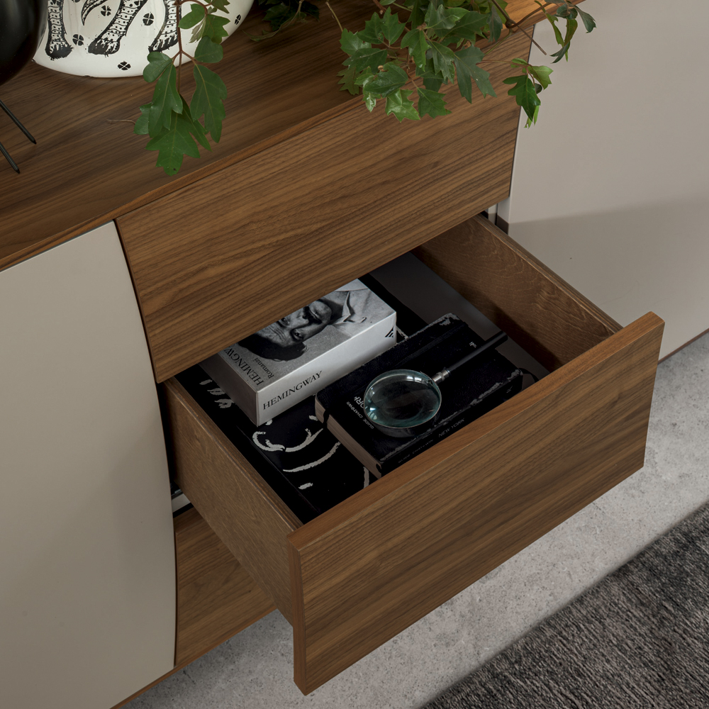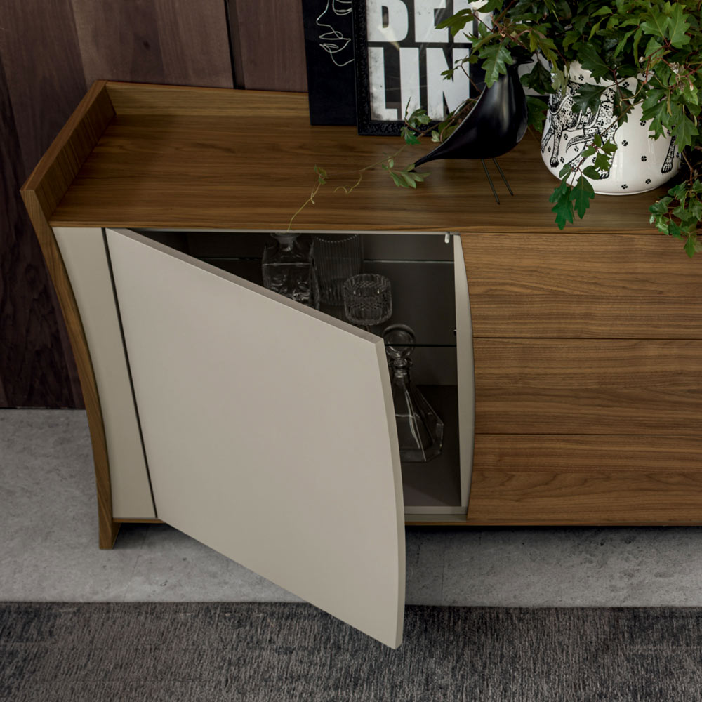 Comoda din lemn furniruit si lacuit cu usi si sertare, design curbat fabricat in Italia.