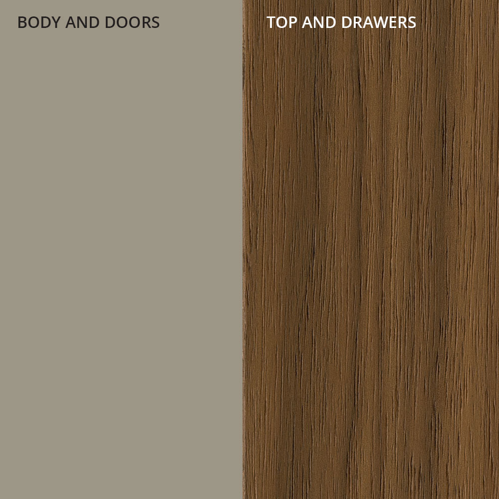 Acest bufet pentru sufragerie are o structura realizata integral din MDF lacuit in finisaj si blat nisip si 2 sertare din lemn furniruit in finisaj nuc Canaletto.