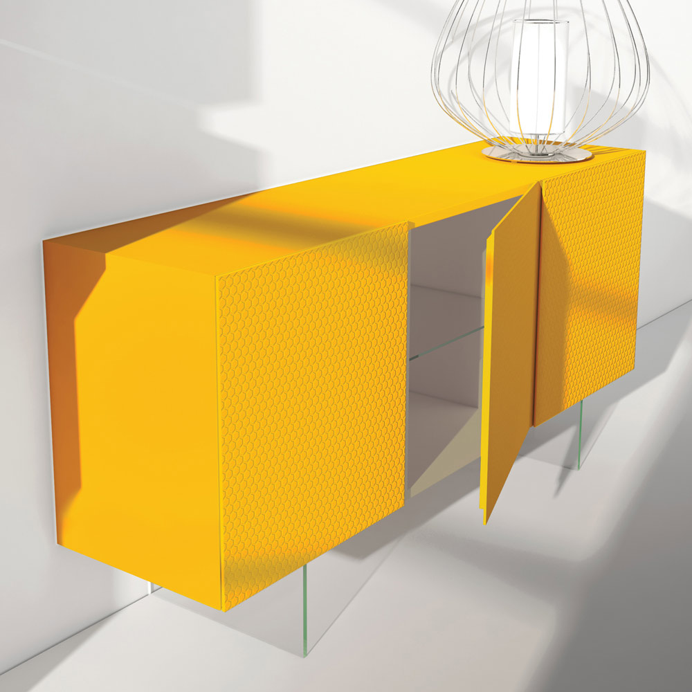 Bufetă pentru living cu structură din MDF lăcuit mat galben canar, inclusiv picioare din sticlă extra-clară . Sistemul de deschidere are 3 uși cu balamale pentru a asigura funcționalitatea și caracterul practic perfect . Acest produs este marcat de gust și design datorită unirii diverselor materiale, a finisajelor sale elegante și rafinate și înfrumusețat de decorul de pe ușă alcătuit din multe plăci mici HPL în formă de fagure . Toate materialele folosite pentru constructie ofera o mare calitate si rezistenta in timp, oferind produsului acea nota unica si de neuitat.
