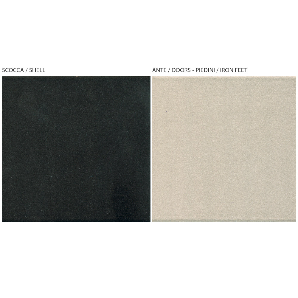 o carcasă de culoare cărbune, rafturi interioare și uși din MDF cu finisaj nichel, panou din spate din placaj și