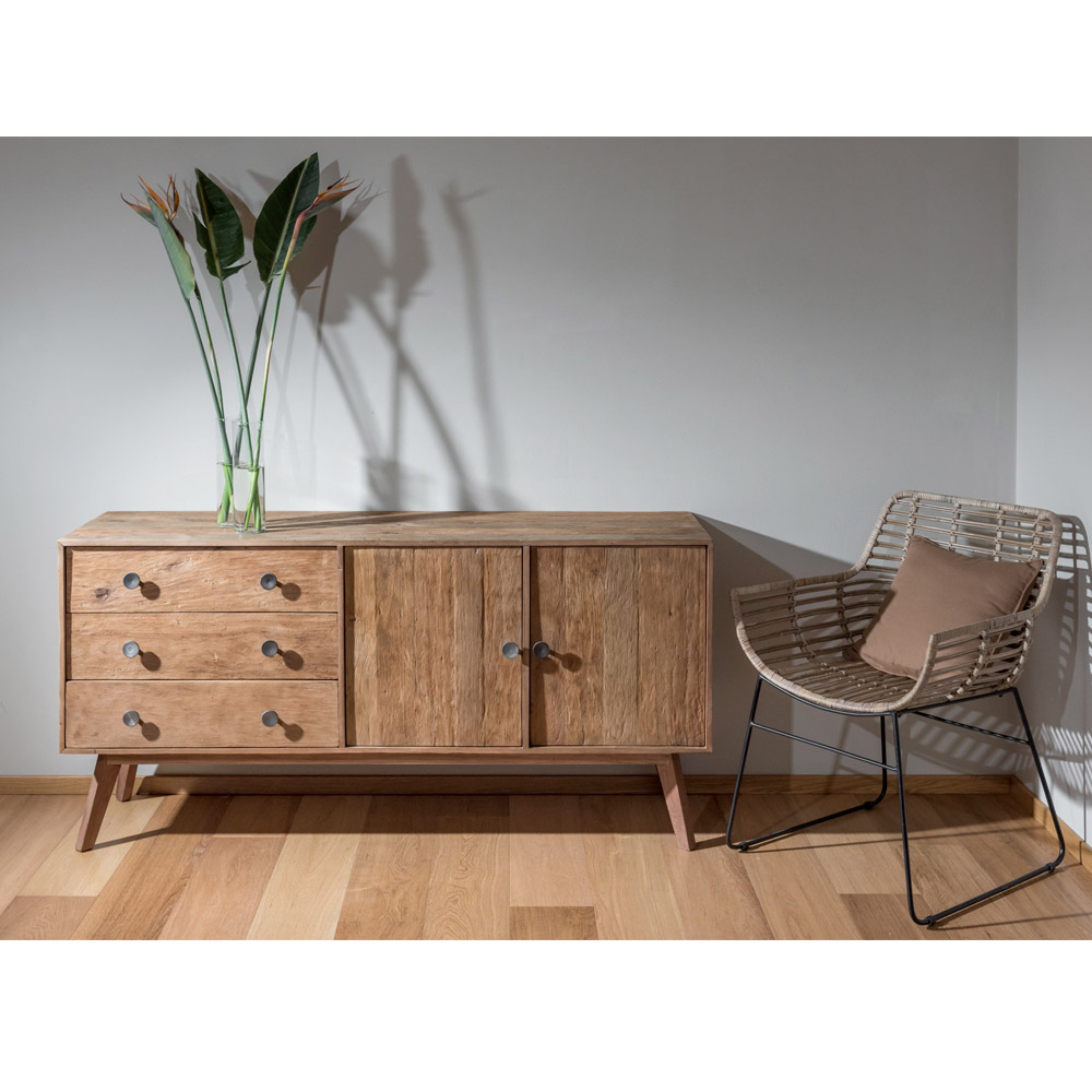 Bufetă de interior din lemn reciclat cu finisaj natural vintage cu 2 uși și 3 sertare mari.