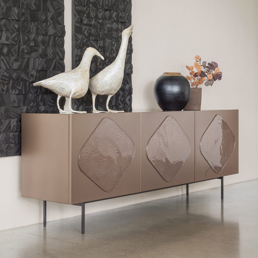 picioarele subțiri metalice pe care se sprijină bufetul. Aceste picioare ridică bufetul de la sol, dând o senzație de lejeritate și aerisire întregii piese de mobilier. Efectul de lejeritate este accentuat de insertul lucios care caracterizeaza usile, detaliu care adauga un plus de rafinament si modernitate designului.