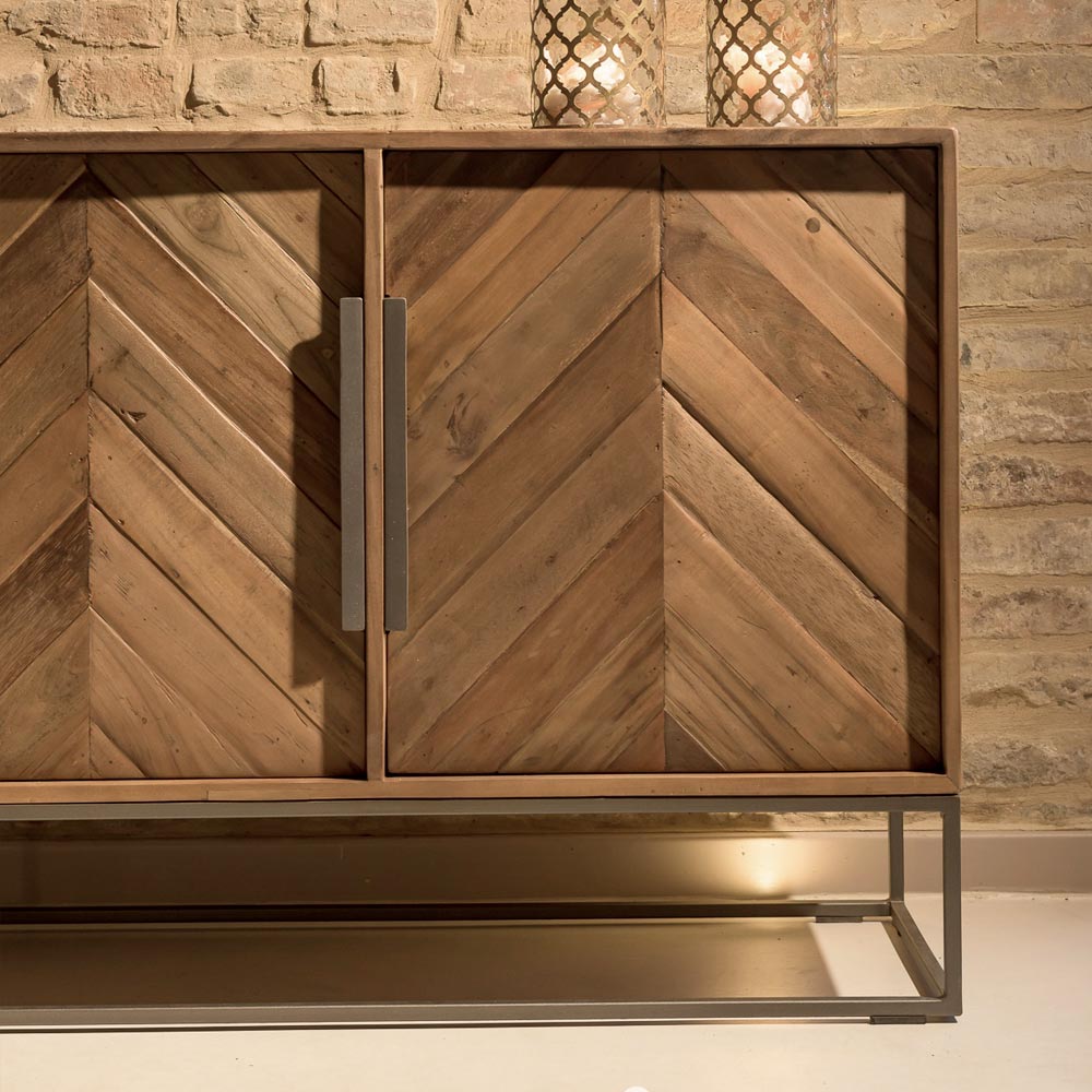 Bufetă de interior realizată din lemn natural reciclat color cafea, cu 4 uși frontale în formă de oase și picioare metalice .