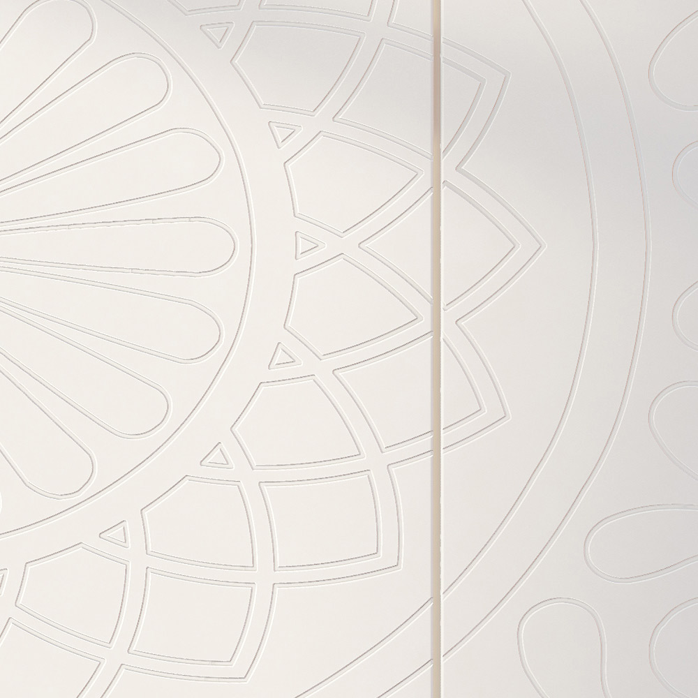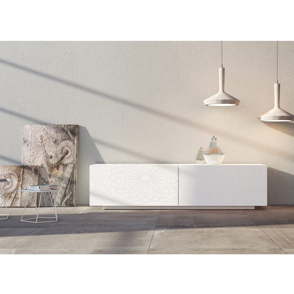 Bufetă modernă cu structură MDF lacuit alb mat compus din 2 uși glisante coplanare care garanteaza o mare functionalitate si practicitate si din soclul lacuit care ofera multa stabilitate. Acest produs este plin de gust și design datorită finisajelor sale elegante și rafinate și decorului în basorelief al ușilor care le face unice în felul lor. Diferitele materiale folosite pentru constructie ofera o mare calitate si rezistenta in timp, oferind produsului acea nota unica si de neuitat.