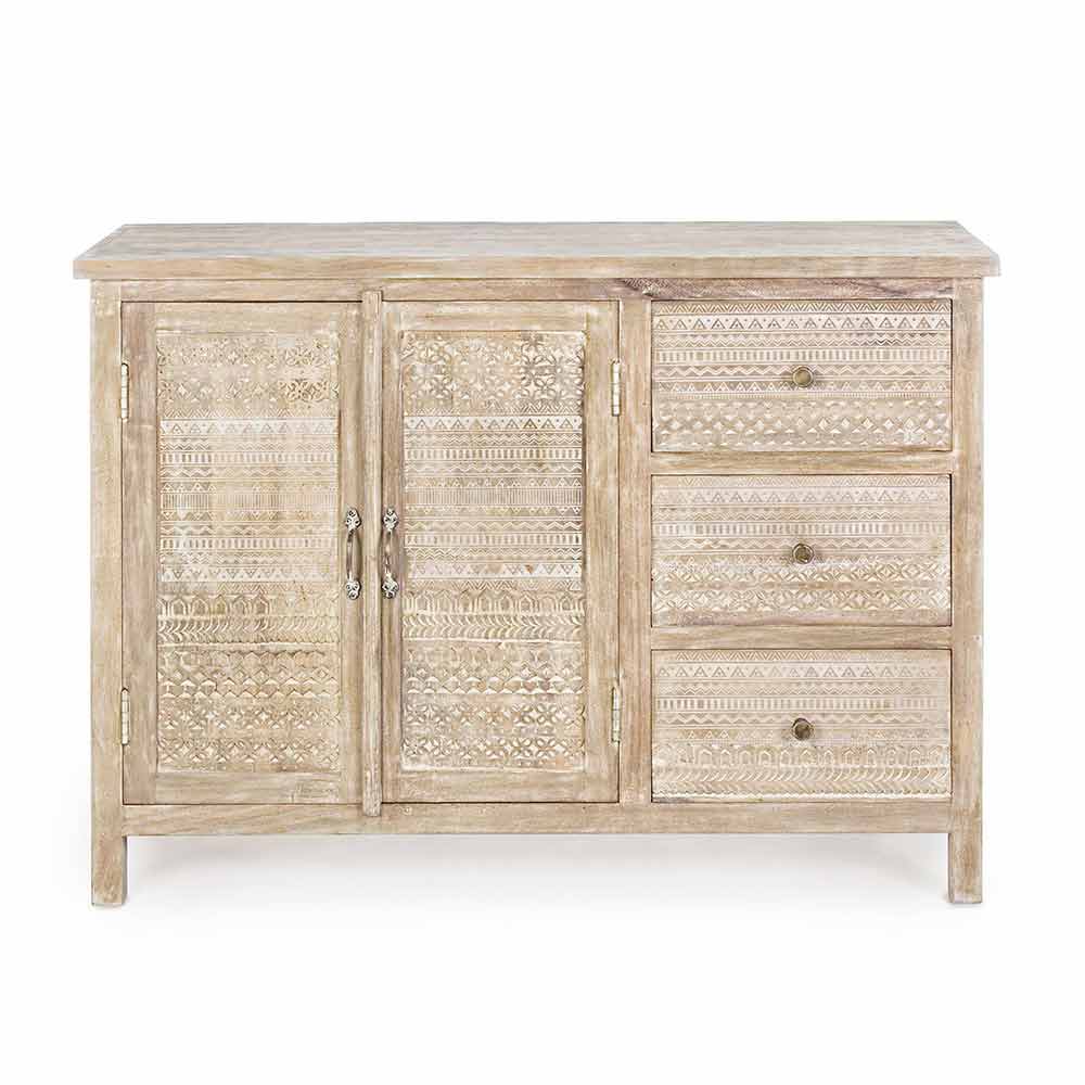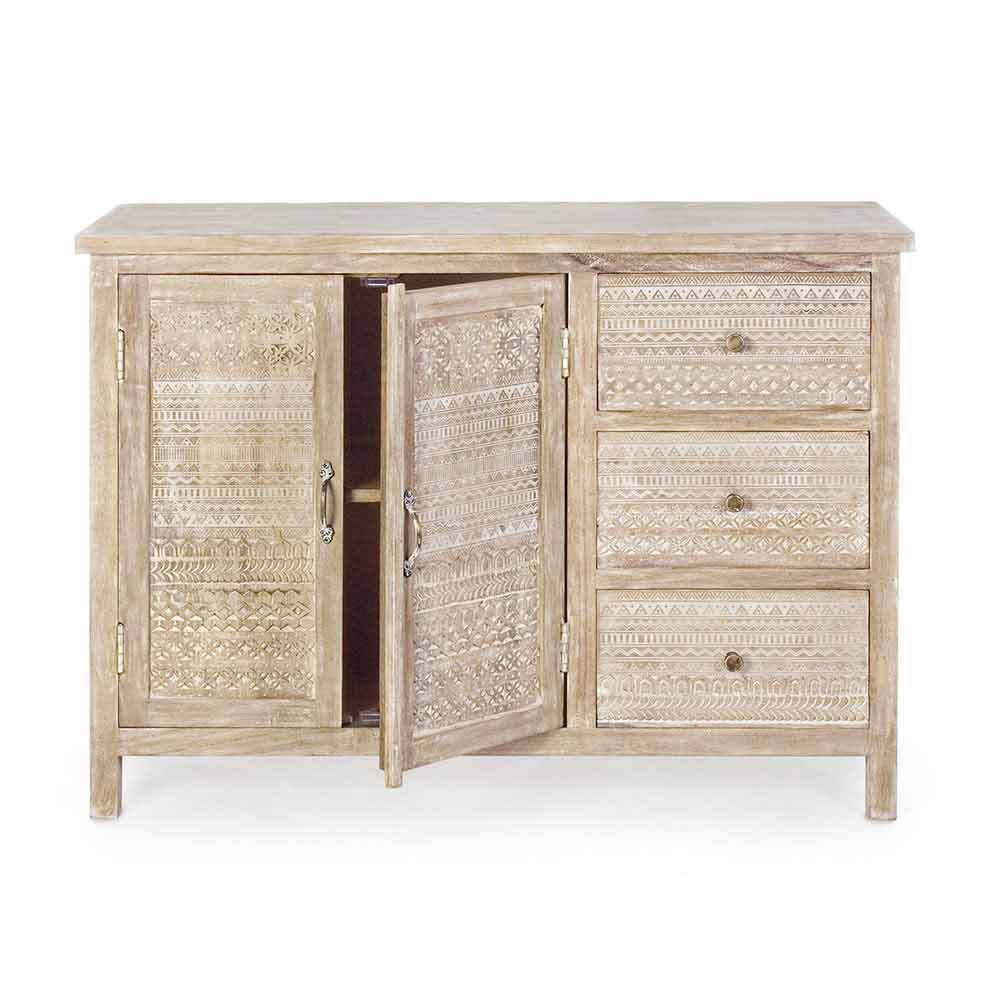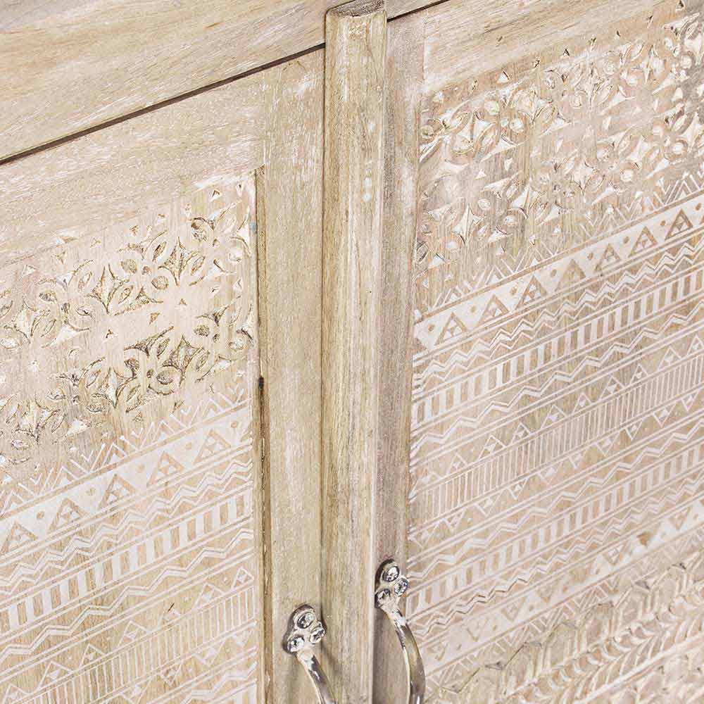 Buffet în stil rustic din lemn de mango cu decorațiuni realizate manual.