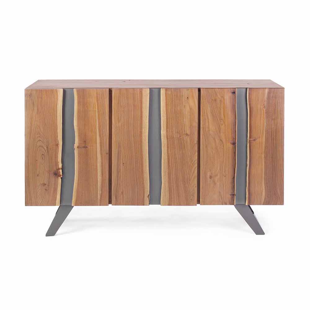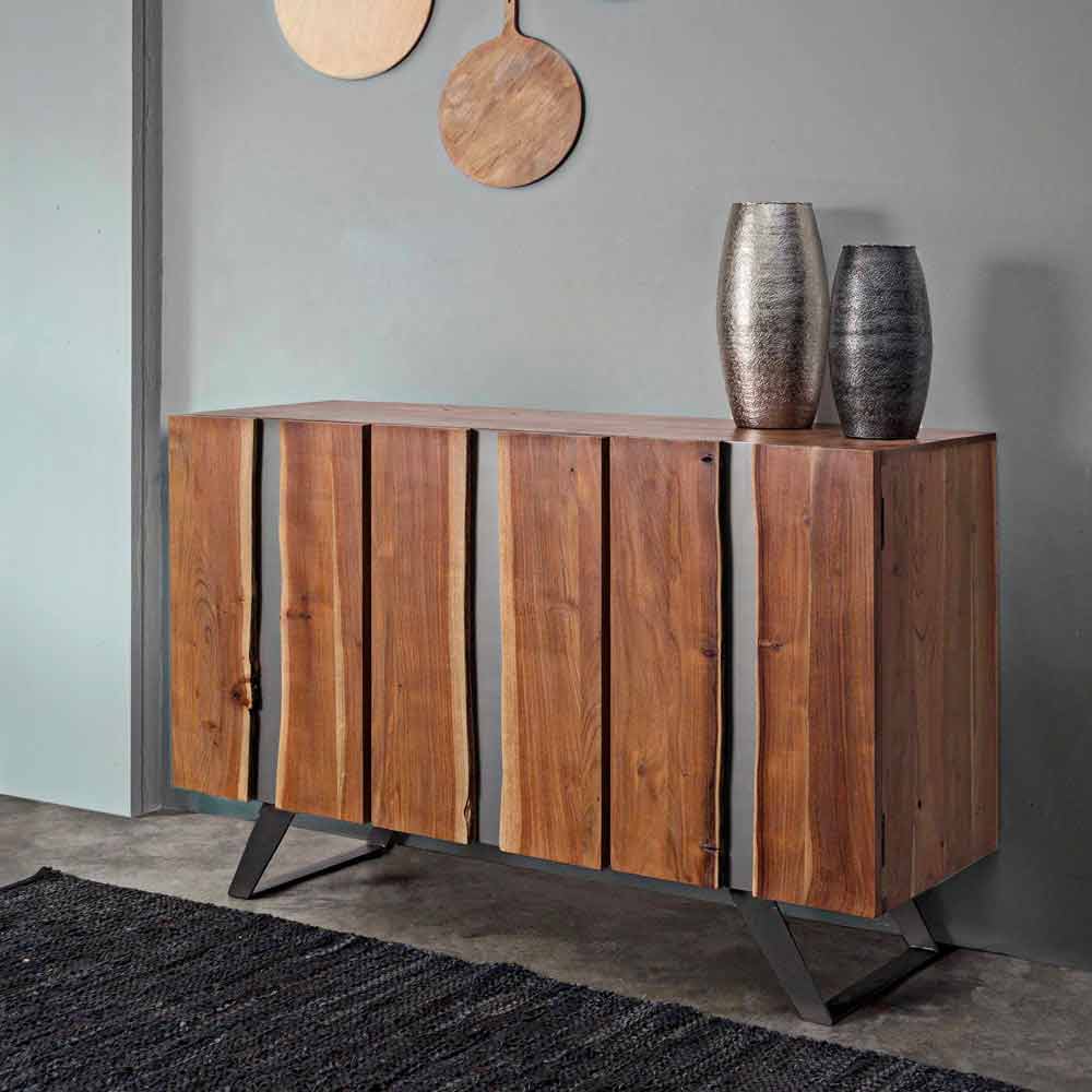 Buffet de design modern din lemn de salcâm cu inserții metalice.