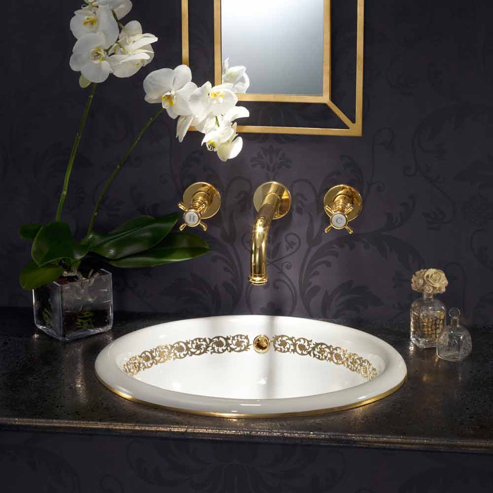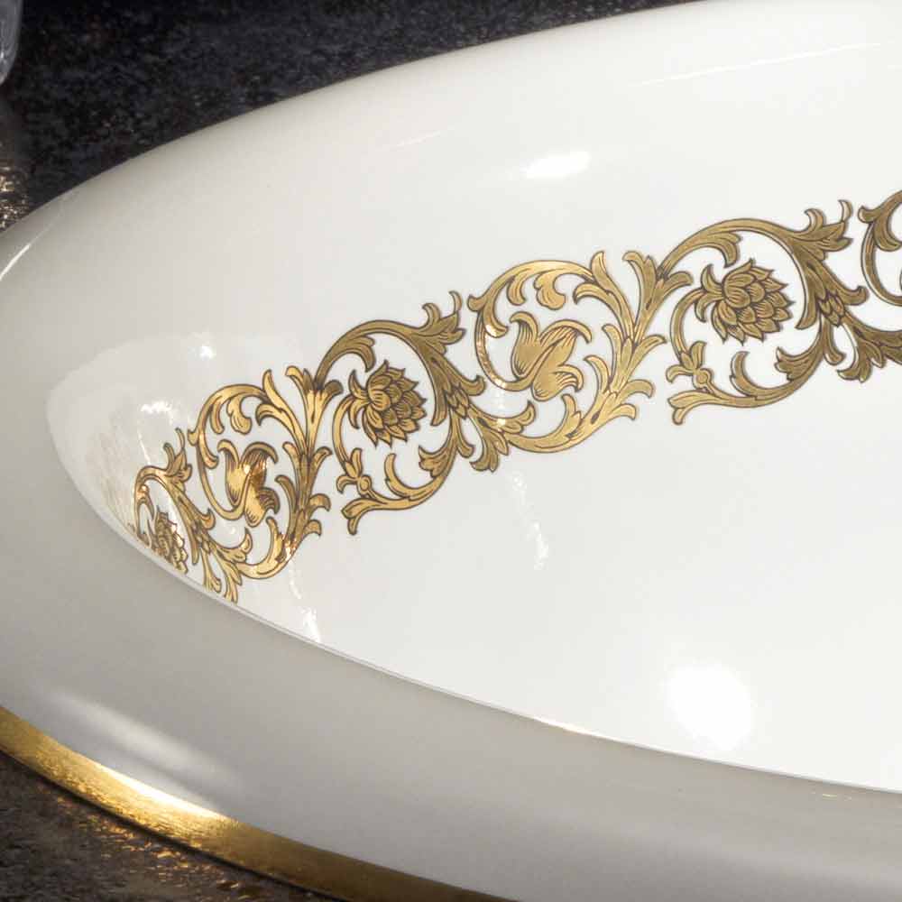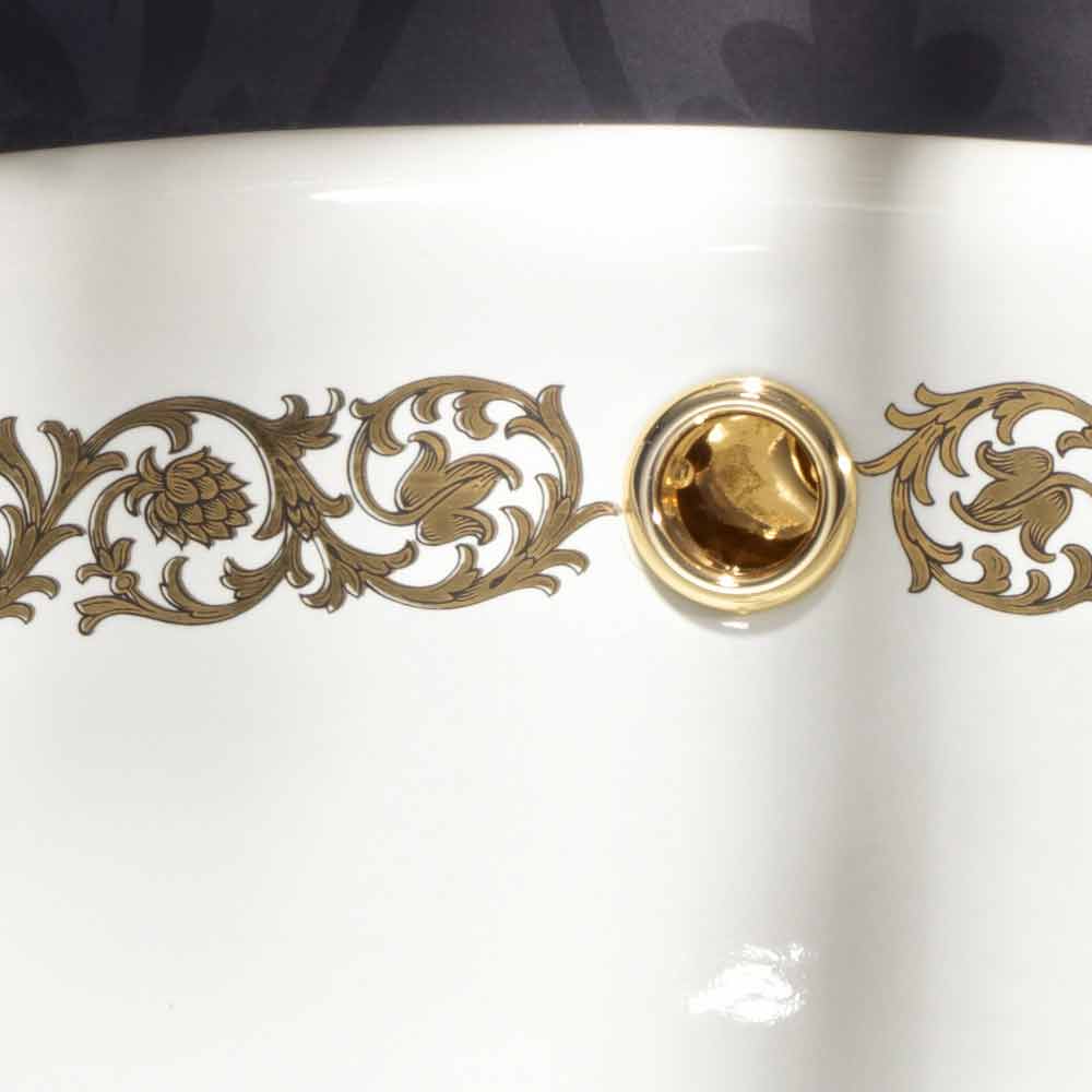 Baie încorporată în baie, fabricată în Italia, în lut de foc, realizată manual, decorată, cu bandă în conul de aur de pin și margine de aur de 24 de kilograme.