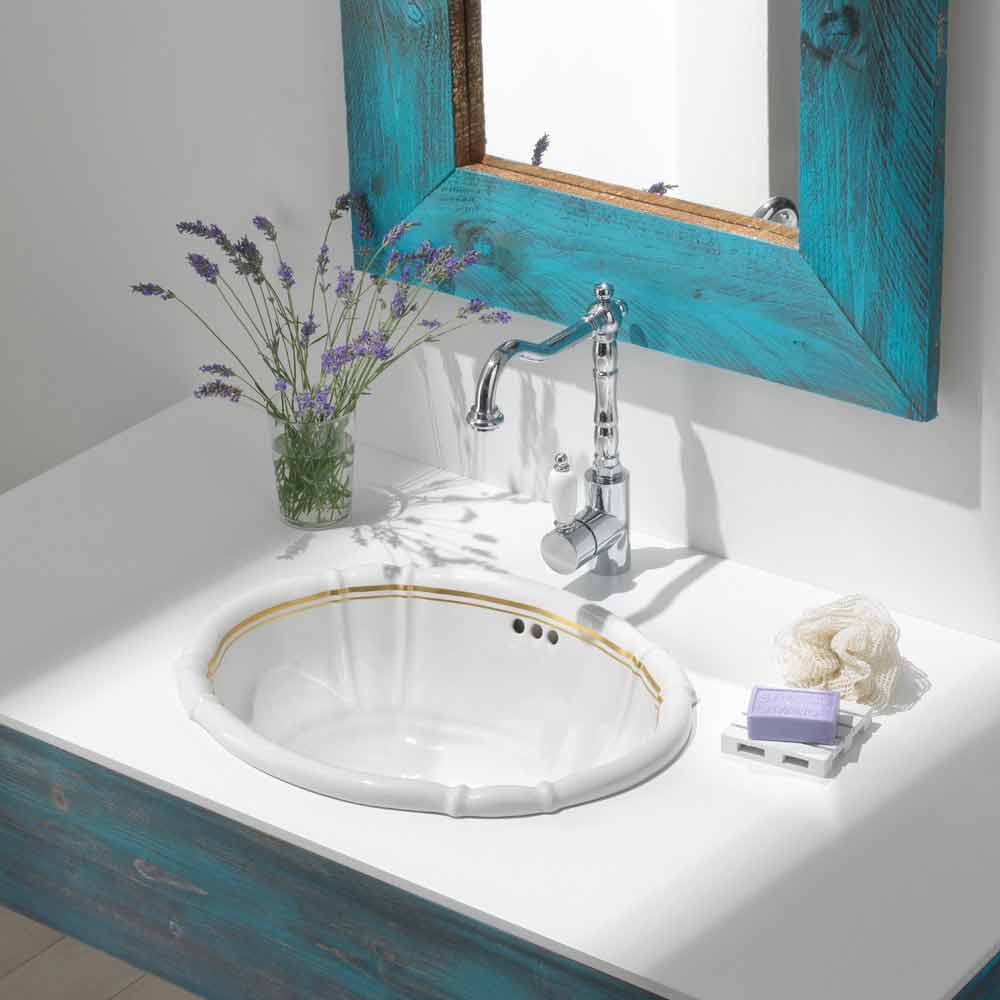 Circulară încorporată în porțelan și aur de 24k, Santiago Baie încorporată în chiuveta manuală din Italia, cu porțelan alb subțire, cu o linie dublă în aur de 24k pe margine.