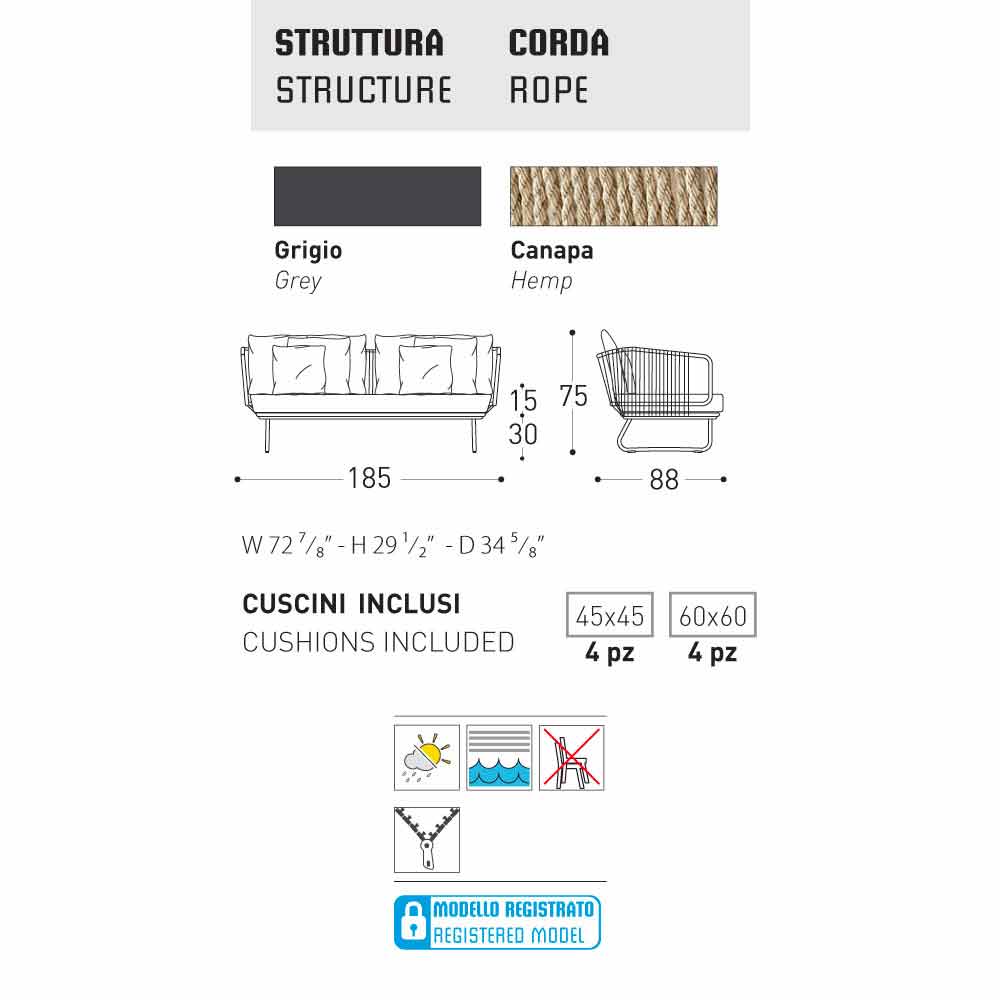 Canapeaua Babylon vine cu 8 perne: 4 perne 45x45 cm și 4 perne 60x60 cm. Capacul este detașabil.