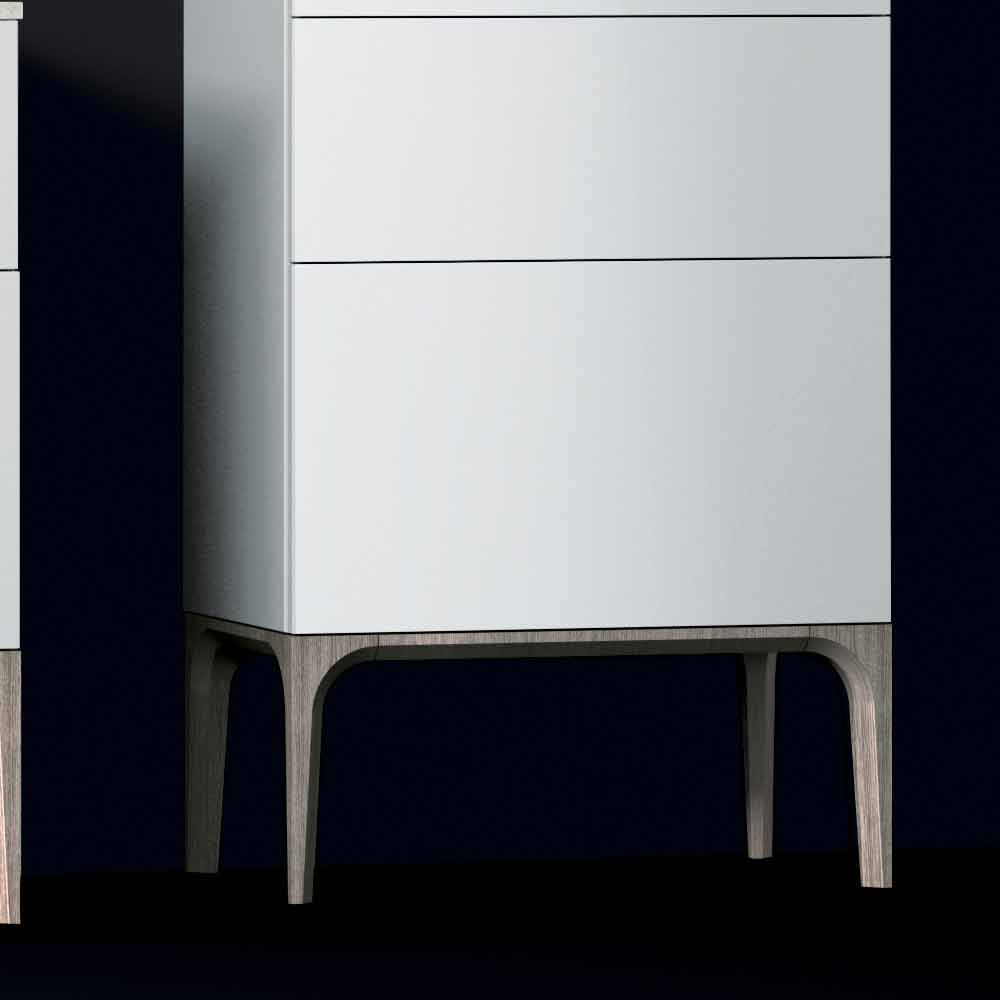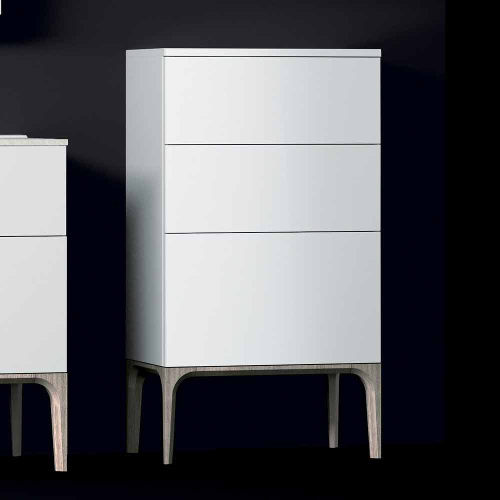 Design piept de sertare cu 3 sertare cu linii solide și armonioase din lemn lăcuit cu picioare de stejar naturale solide, disponibile în diferite finisaje.