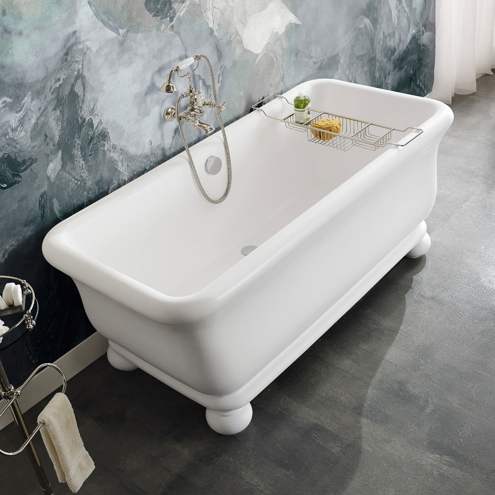 Cada de baie dreptunghiulara alba in Solid Surface, amestec de rasina acrilica modificata cu compusi minerali, cu preaplin pentru coloana de deseuri. Cadă de baie originală înălțată de 4 picioare în suprafață solidă opțională. Alegere alb mat sau lucios .