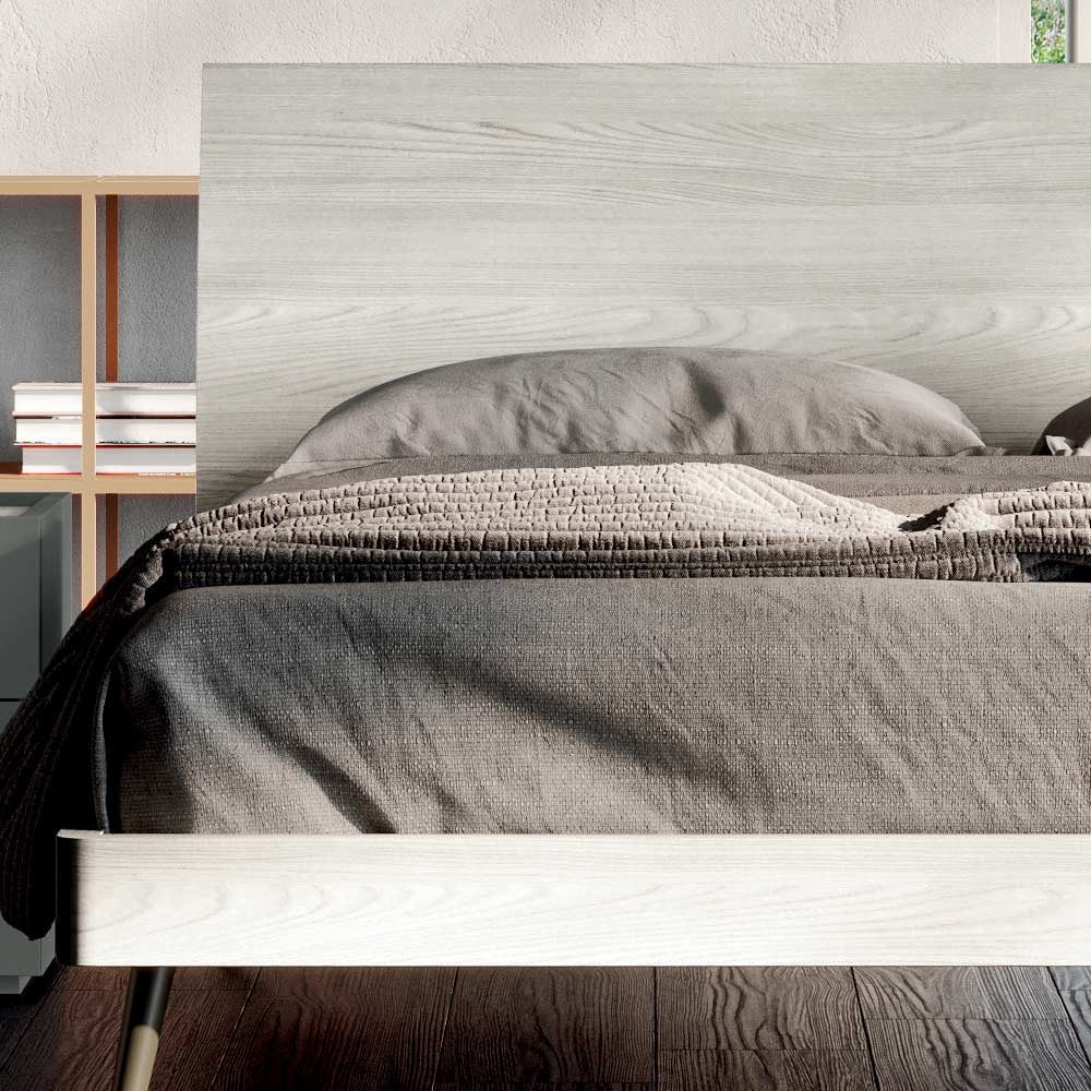 dublu cu cadru de pat și tăblie din lemn texturat decolorat și picioare din
